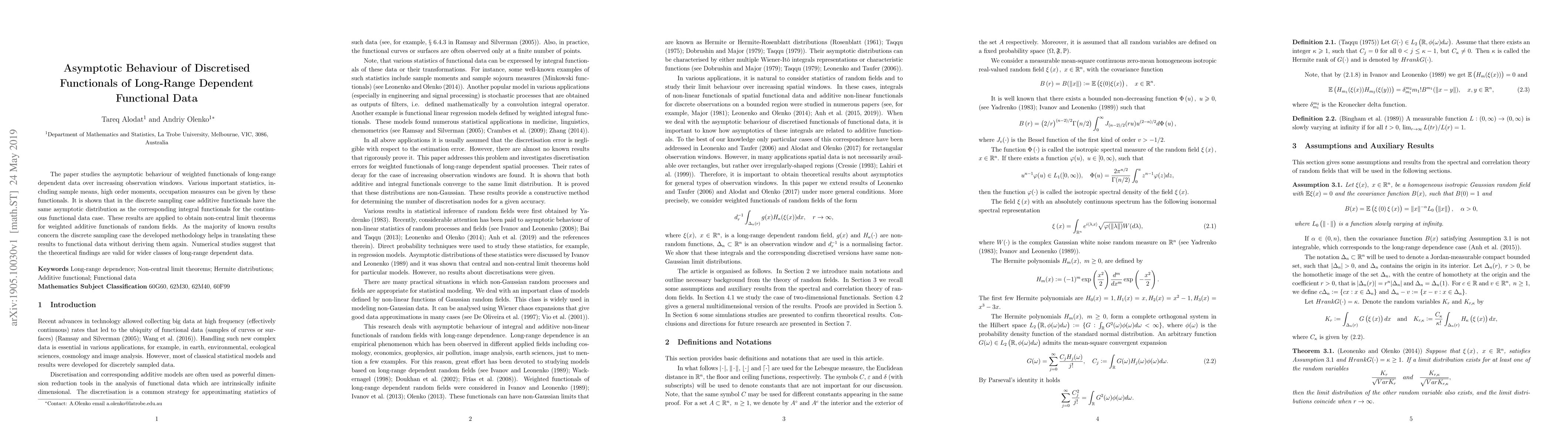 This paper investigates the asymptotic behaviour of discretised functionals of long-range dependent data, demonstrating that discrete additive functionals share the same asymptotic distribution as their continuous counterparts. The methodology facilitates non-central limit theorems for weighted additive functionals of random fields, extending existing discrete sampling results to functional data without redundant derivations.