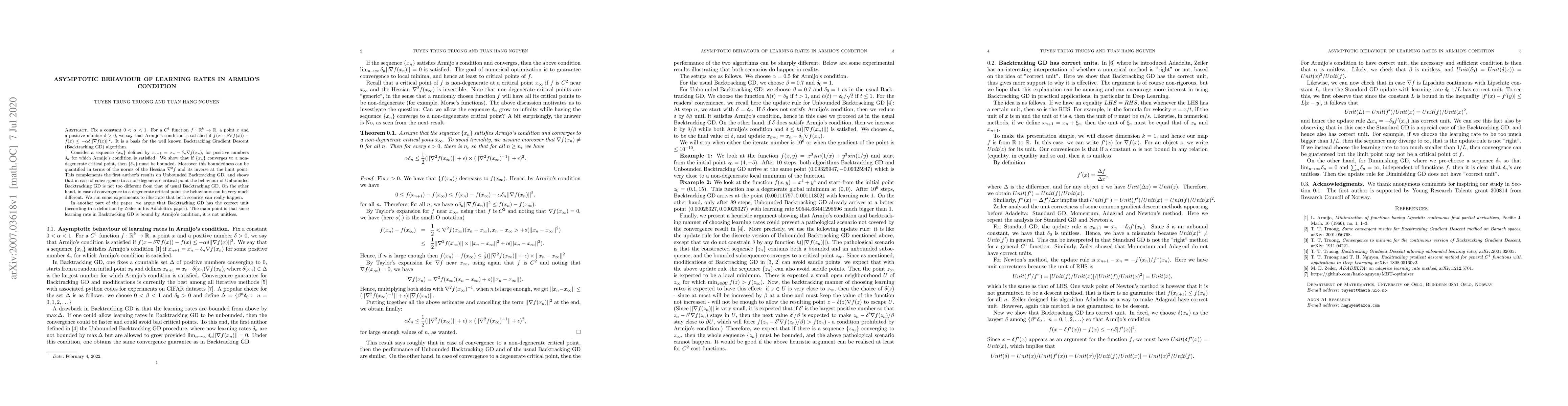 Researchers studied the asymptotic behavior of learning rates in Armijo's condition for Backtracking Gradient Descent, finding that convergence to a non-degenerate critical point implies boundedness of the learning rate sequence.