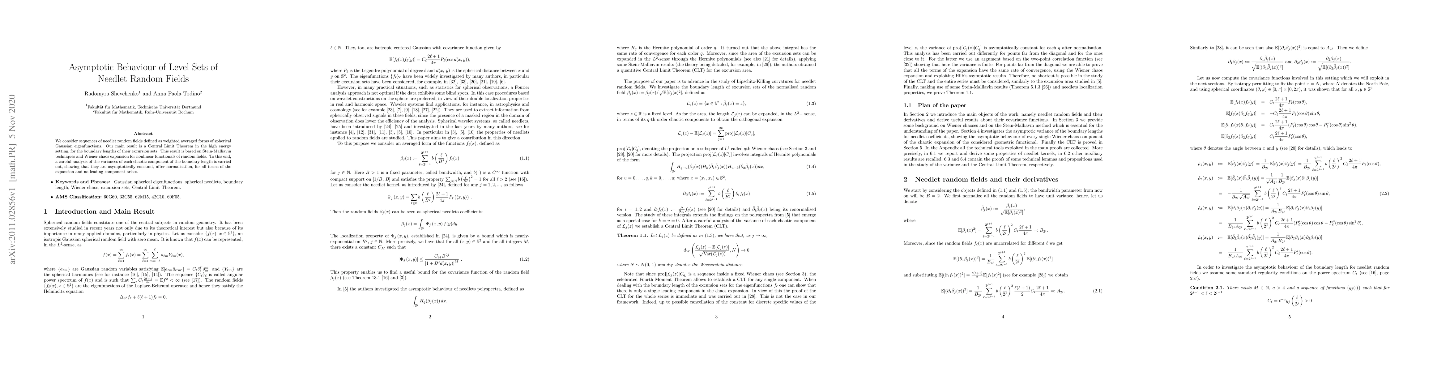 We consider sequences of needlet random fields defined as weighted averaged forms of spherical Gaussian eigenfunctions. Our main result is a Central Limit Theorem in the high energy setting, for the boundary lengths of their excursion sets. This result is based on Stein-Malliavin techniques and Wiener chaos expansion for nonlinear functionals of random fields. To this end, a careful analysis of the variances of each chaotic component of the boundary length is carried out, showing that they are asymptotically constant, after normalisation, for all terms of the expansion and no leading component arises.