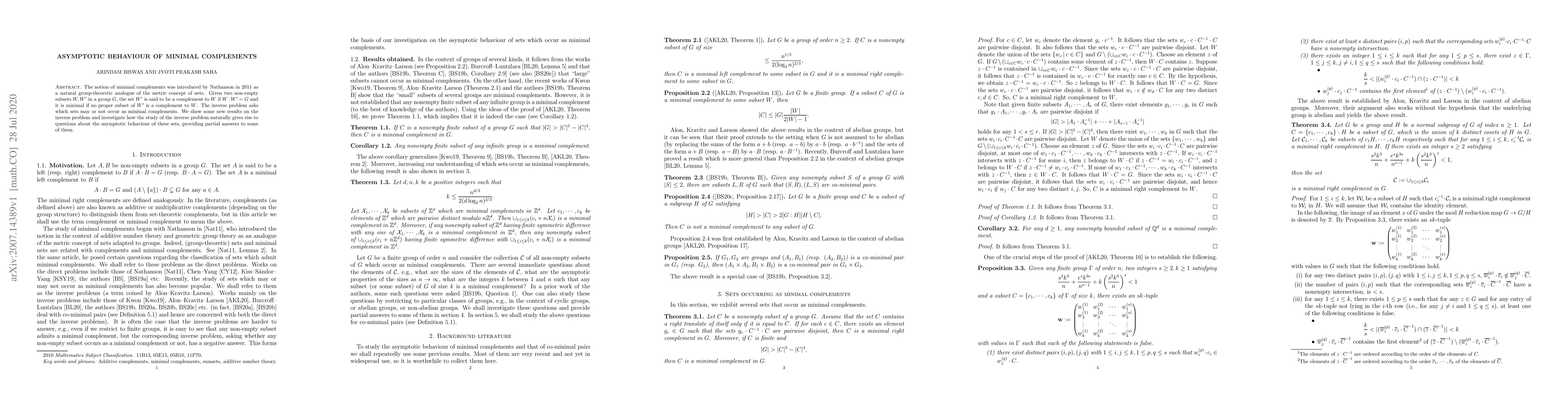 This paper explores the inverse problem concerning minimal complements in group theory, introduced by Nathanson, and investigates their asymptotic behavior, providing new insights and partial answers to questions arising from this study.