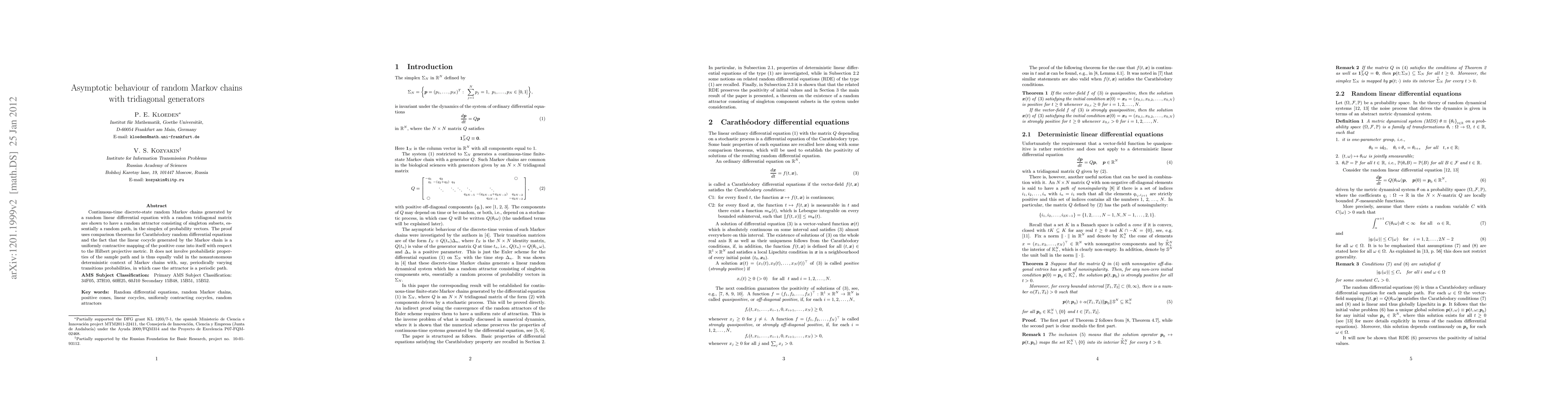Continuous-time discrete-state random Markov chains generated by a random linear differential equation with a random tridiagonal matrix are shown to have a random attractor consisting of singleton subsets, essentially a random path, in the simplex of probability vectors. The proof uses comparison theorems for Carath\'eodory random differential equations and the fact that the linear cocycle generated by the Markov chain is a uniformly contractive mapping of the positive cone into itself with respect to the the Hilbert projective metric. It does not involve probabilistic properties of the sample path and is thus equally valid in the nonautonomous deterministic context of Markov chains with, say, periodically varying transitions probabilities, in which case the attractor is a periodic path.
