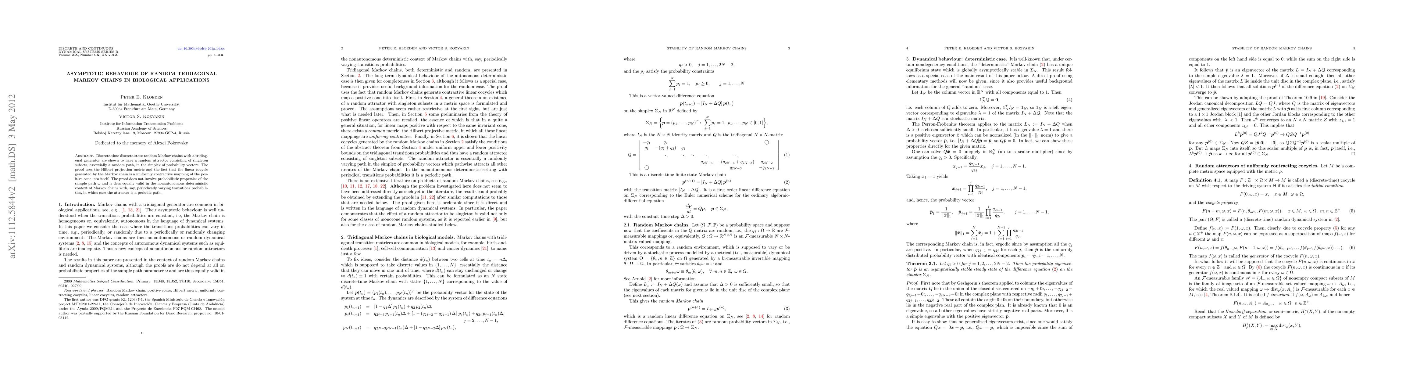 Discrete-time discrete-state random Markov chains with a tridiagonal generator are shown to have a random attractor consisting of singleton subsets, essentially a random path, in the simplex of probability vectors. The proof uses the Hilbert projection metric and the fact that the linear cocycle generated by the Markov chain is a uniformly contractive mapping of the positive cone into itself. The proof does not involve probabilistic properties of the sample path and is thus equally valid in the nonautonomous deterministic context of Markov chains with, say, periodically varying transitions probabilities, in which case the attractor is a periodic path.