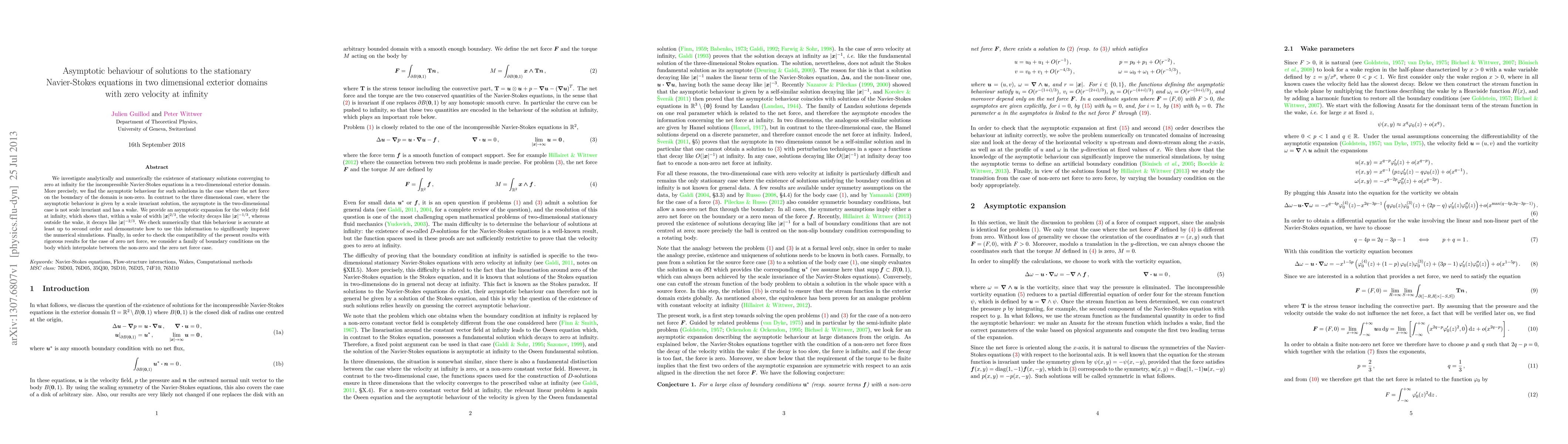 We investigate analytically and numerically the existence of stationary solutions converging to zero at infinity for the incompressible Navier-Stokes equations in a two-dimensional exterior domain. More precisely, we find the asymptotic behaviour for such solutions in the case where the net force on the boundary of the domain is non-zero. In contrast to the three dimensional case, where the asymptotic behaviour is given by a scale invariant solution, the asymptote in the two-dimensional case is not scale invariant and has a wake. We provide an asymptotic expansion for the velocity field at infinity, which shows that, within a wake of width $|\boldsymbol{x}|^{2/3}$, the velocity decays like $|\boldsymbol{x}|^{-1/3}$, whereas outside the wake, it decays like $|\boldsymbol{x}|^{-2/3}$. We check numerically that this behaviour is accurate at least up to second order and demonstrate how to use this information to significantly improve the numerical simulations. Finally, in order to check the compatibility of the present results with rigorous results for the case of zero net force, we consider a family of boundary conditions on the body which interpolate between the non-zero and the zero net force case.