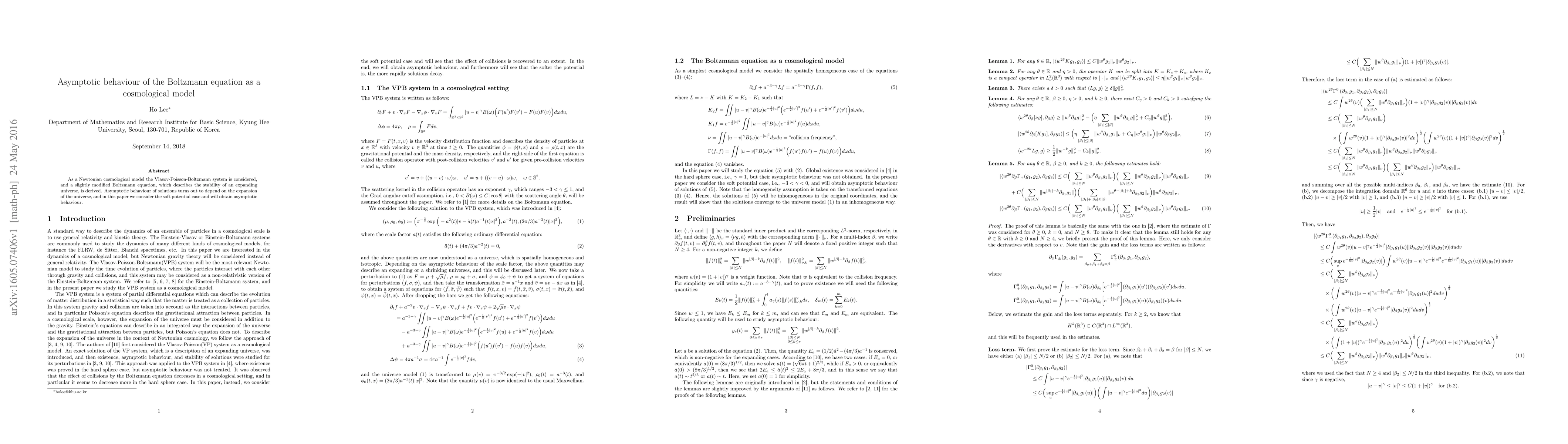This paper investigates the asymptotic behavior of a modified Boltzmann equation within a Newtonian cosmological model, focusing on the stability of an expanding universe. It derives the asymptotic behavior for the soft potential case, revealing its dependence on the universe's expansion.