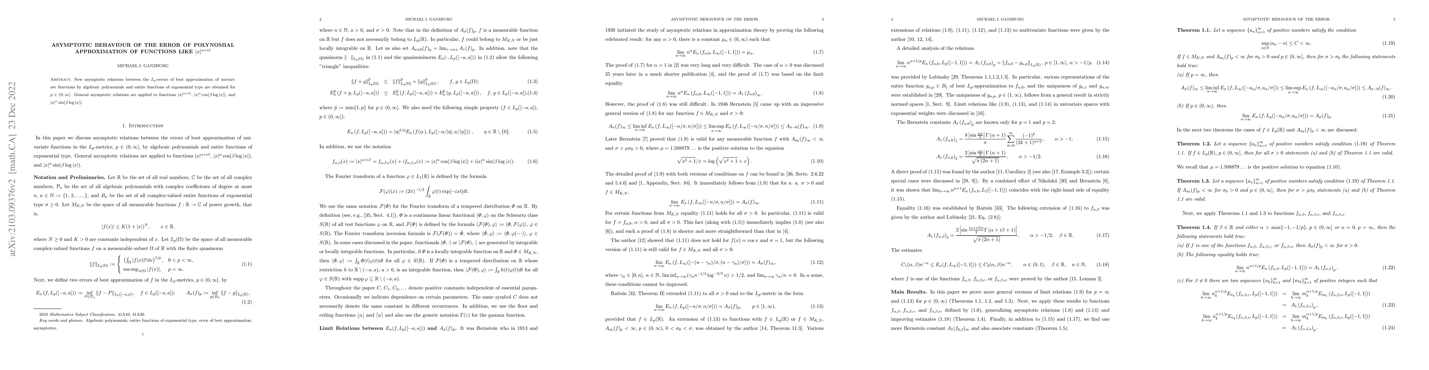 This paper derives new asymptotic relations for the $L_p$-errors in approximating functions like $\vert x\vert^{\alpha+i\beta}$ using algebraic polynomials and entire functions, applicable to specific cases such as $\vert x\vert^{\alpha}\cos(\beta\log\vert x\vert)$ and $\vert x\vert^{\alpha}\sin(\beta\log\vert x\vert)$.