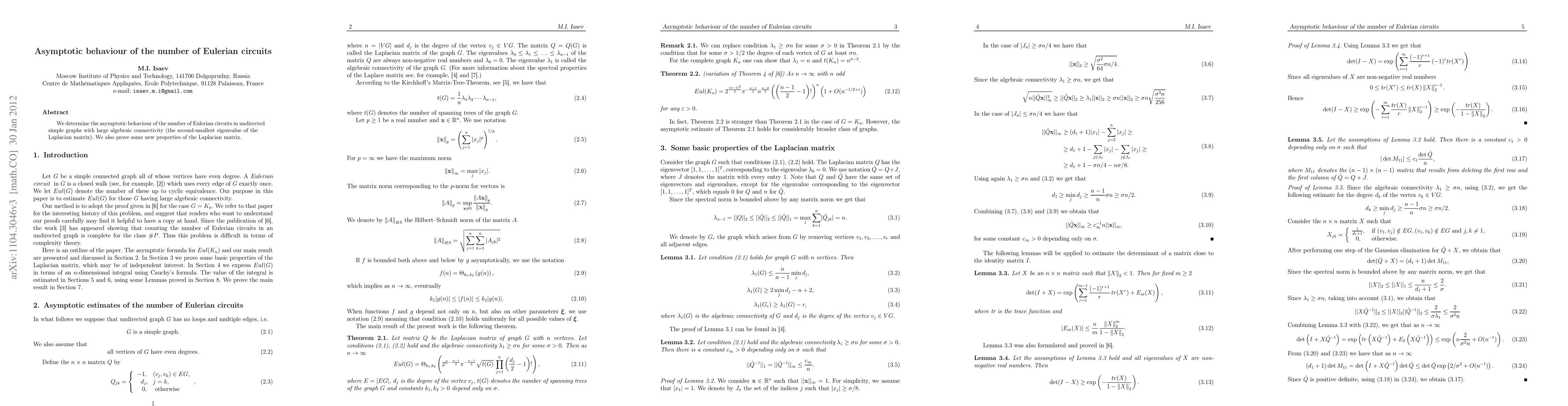 We determine the asymptotic behaviour of the number of the Eulerian circuits in undirected simple graphs with large algebraic connectivity (the second-smallest eigenvalue of the Laplacian matrix). We also prove some new properties of the Laplacian matrix.