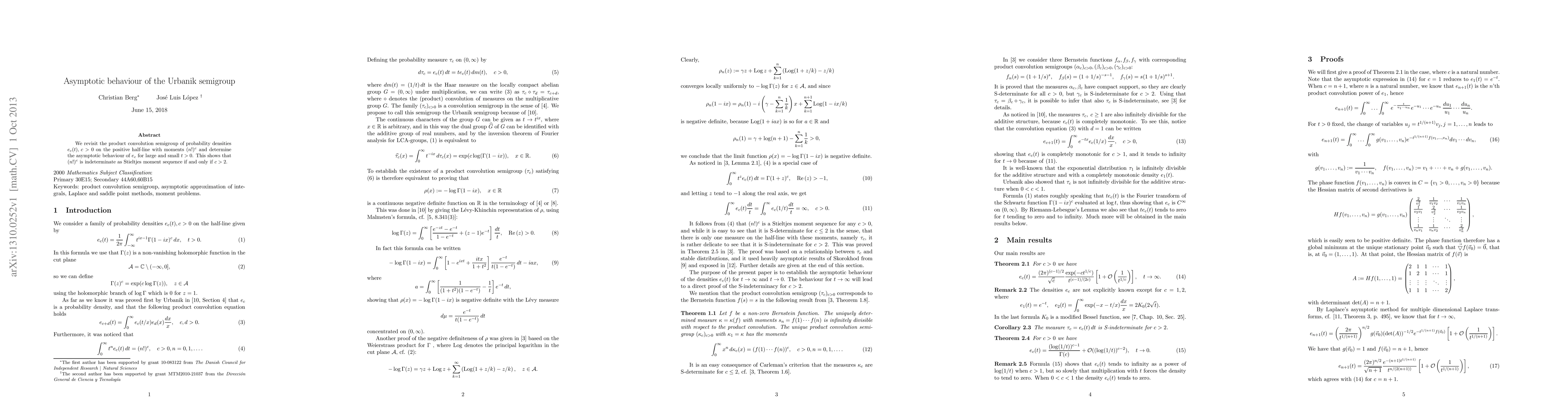We revisit the product convolution semigroup of probability densities e_c(t),c>0 on the positive half-line with moments (n!)^c and determine the asymptotic behaviour of e_c(t) for large and small t>0. This shows that (n!)^c is indeterminate as Stieltjes moment sequence if and only if c>2