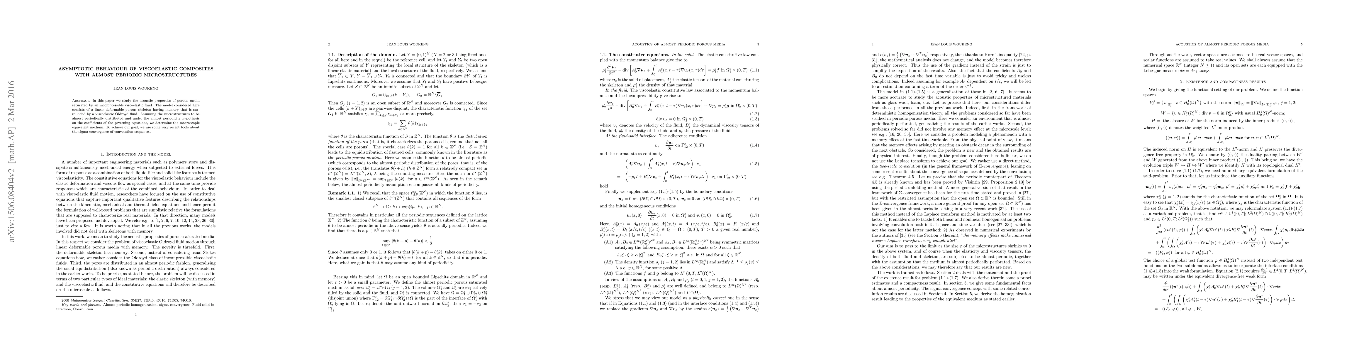 Researchers studied the acoustic properties of porous media saturated with a viscoelastic fluid, finding the equivalent macroscopic medium under almost periodic microstructures. They developed a method to analyze this complex system using tools for sigma convergence of convolution sequences.