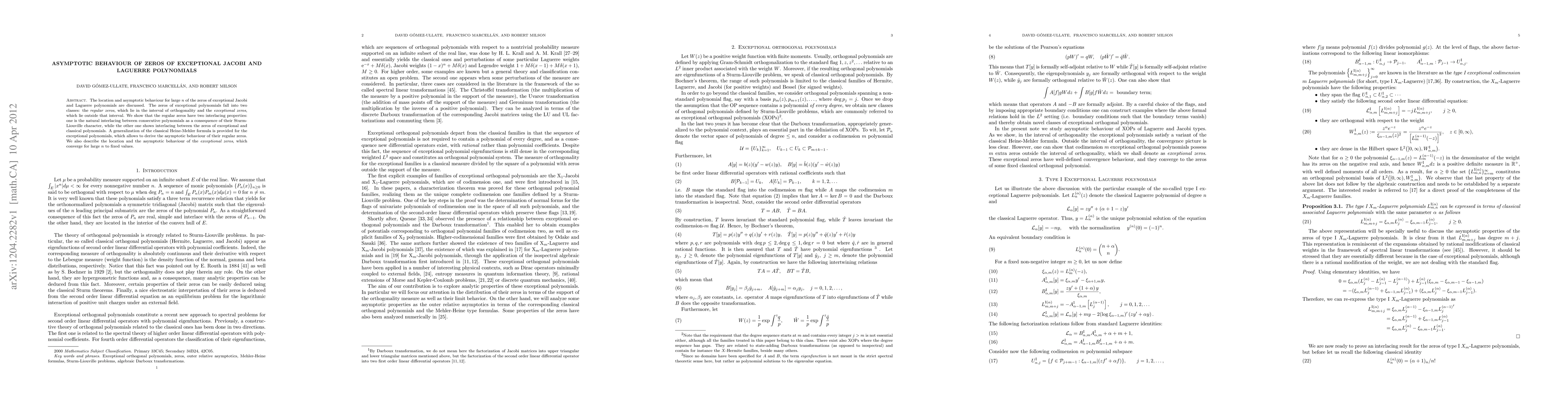 This paper discusses the asymptotic behavior of zeros for exceptional Jacobi and Laguerre polynomials, distinguishing between regular zeros within the orthogonality interval and exceptional zeros outside. It reveals interlacing properties of regular zeros and derives their asymptotic behavior through a generalized Heine-Mehler formula, while also describing the convergence of exceptional zeros to fixed values as n grows large.