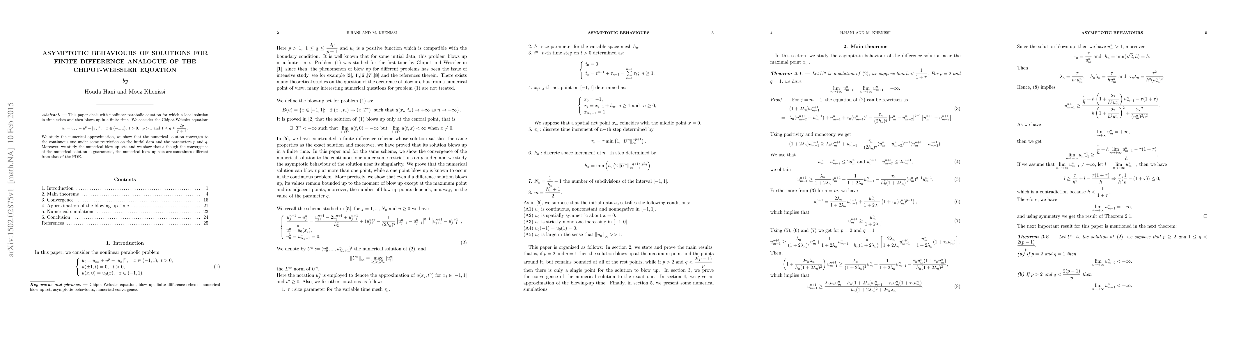 This paper deals with nonlinear parabolic equation for which a local solution in time exists and then blows up in a finite time. We consider the Chipot-Weissler equation. We study the numerical approximation, we show that the numerical solution converges to the continuous one under some restriction on the initial data and the parameters of the non linearity. Moreover, we study the numerical blow up sets and we show that although the convergence of the numerical solution is guaranteed, the numerical blow up sets are sometimes different from that of the PDE