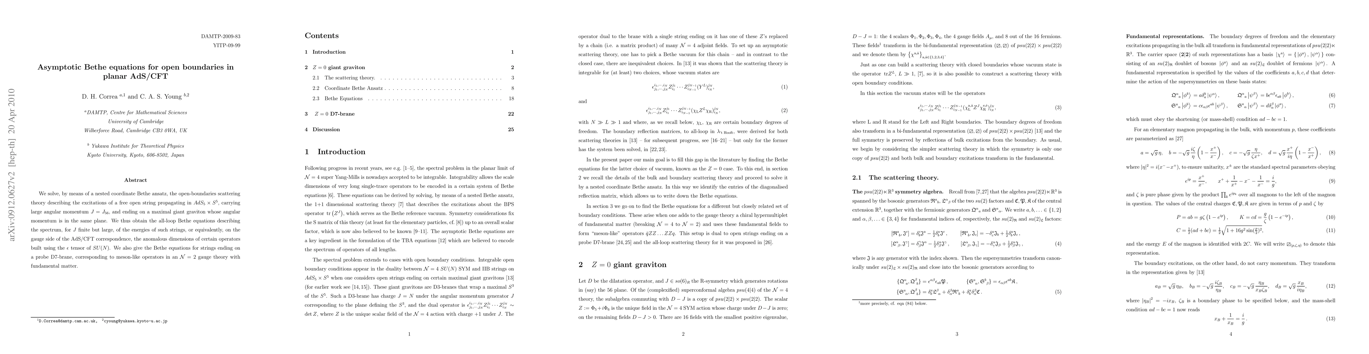 We solve, by means of a nested coordinate Bethe ansatz, the open-boundaries scattering theory describing the excitations of a free open string propagating in $AdS_5\times S^5$, carrying large angular momentum $J=J_{56}$, and ending on a maximal giant graviton whose angular momentum is in the same plane. We thus obtain the all-loop Bethe equations describing the spectrum, for $J$ finite but large, of the energies of such strings, or equivalently, on the gauge side of the AdS/CFT correspondence, the anomalous dimensions of certain operators built using the epsilon tensor of SU(N). We also give the Bethe equations for strings ending on a probe D7-brane, corresponding to meson-like operators in an $\mathcal N=2$ gauge theory with fundamental matter.