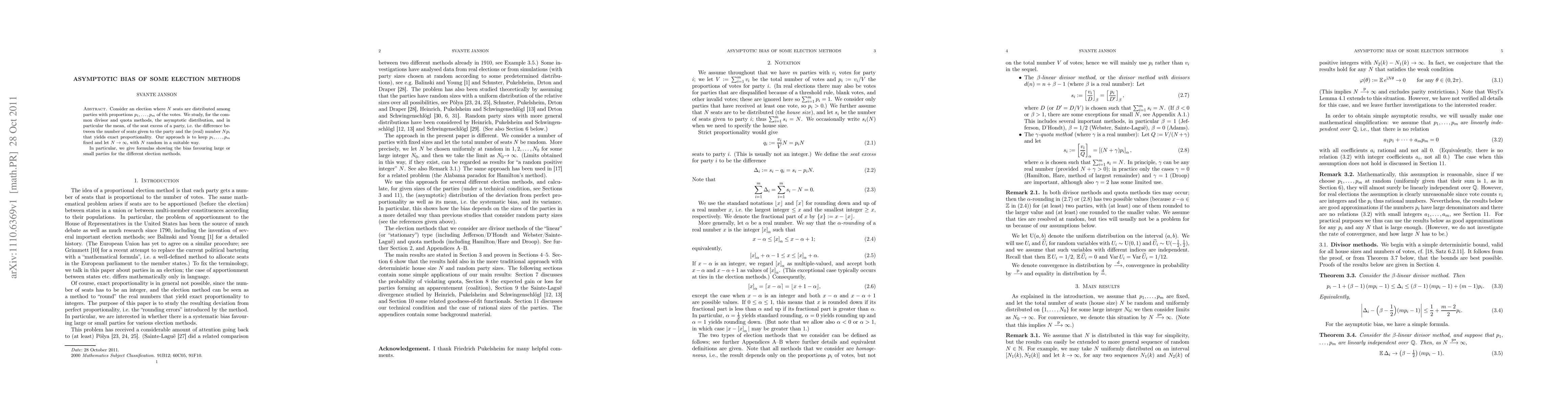 Consider an election where N seats are distributed among parties with proportions p_1,...,p_m of the votes. We study, for the common divisor and quota methods, the asymptotic distribution, and in particular the mean, of the seat excess of a party, i.e. the difference between the number of seats given to the party and the (real) number Np_i that yields exact proportionality. Our approach is to keep p_1,...,p_m fixed and let N tend to infinity, with N random in a suitable way. In particular, we give formulas showing the bias favouring large or small parties for the different election methods.