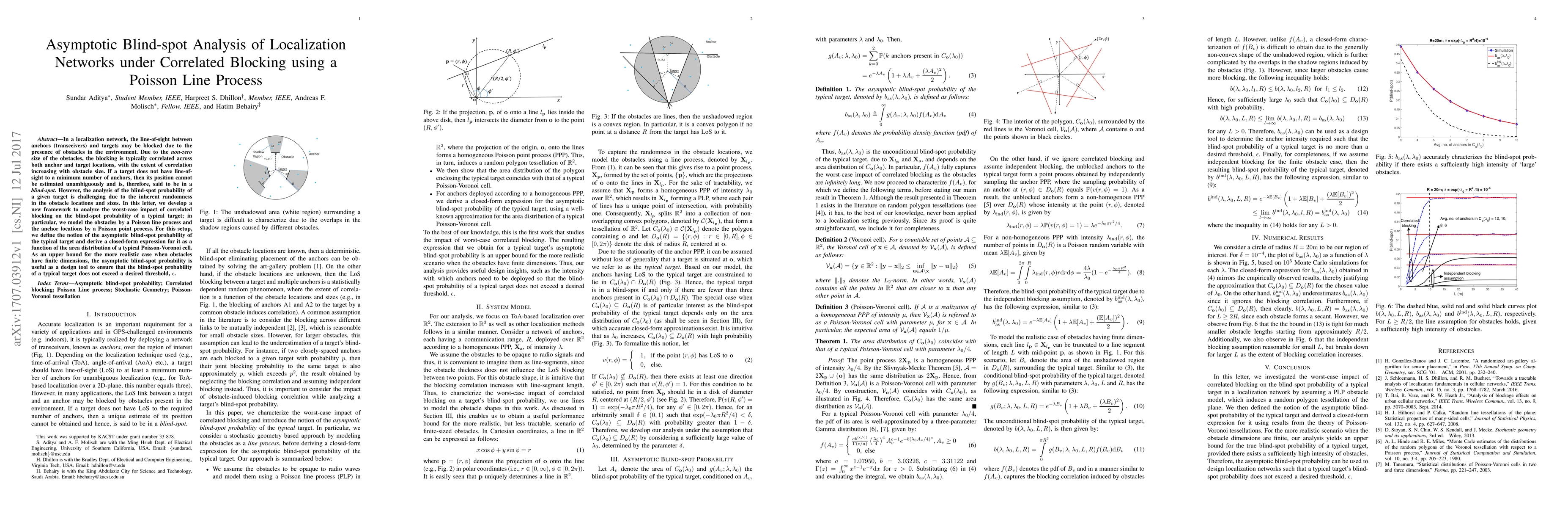 This paper develops a framework to analyze the impact of correlated blocking on localization networks, modeling obstacles with a Poisson line process and anchors with a Poisson point process. It derives a closed-form expression for the asymptotic blind-spot probability, providing a useful design tool to ensure that the blind-spot probability does not exceed a desired threshold.