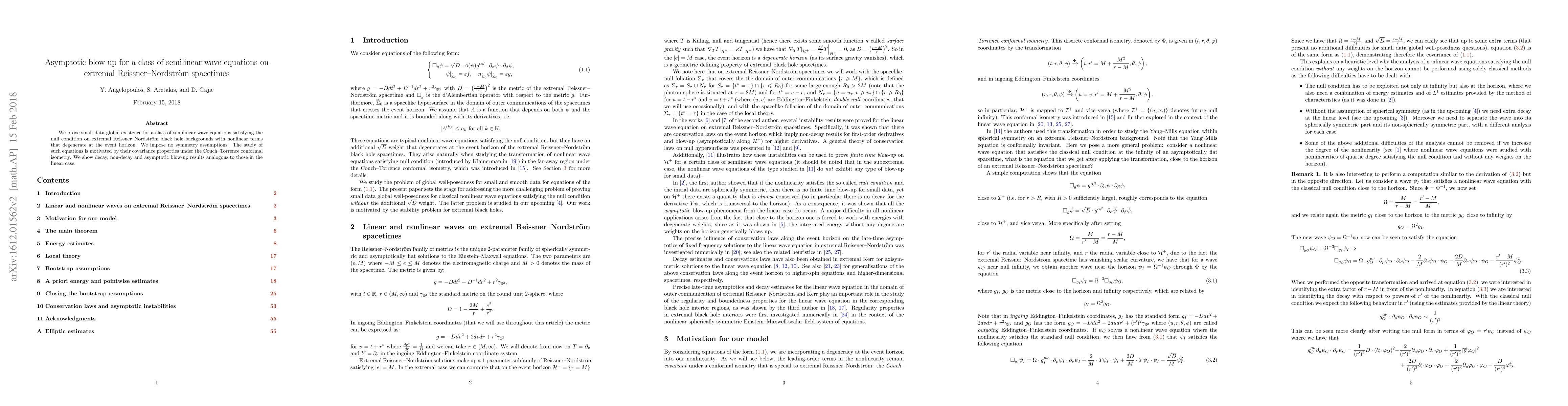 This paper proves small data global existence for semilinear wave equations on extremal Reissner-Nordström black hole backgrounds, demonstrating decay, non-decay, and asymptotic blow-up behaviors. The study is motivated by the equations' covariance under the Couch-Torrence conformal isometry, with no symmetry assumptions imposed.