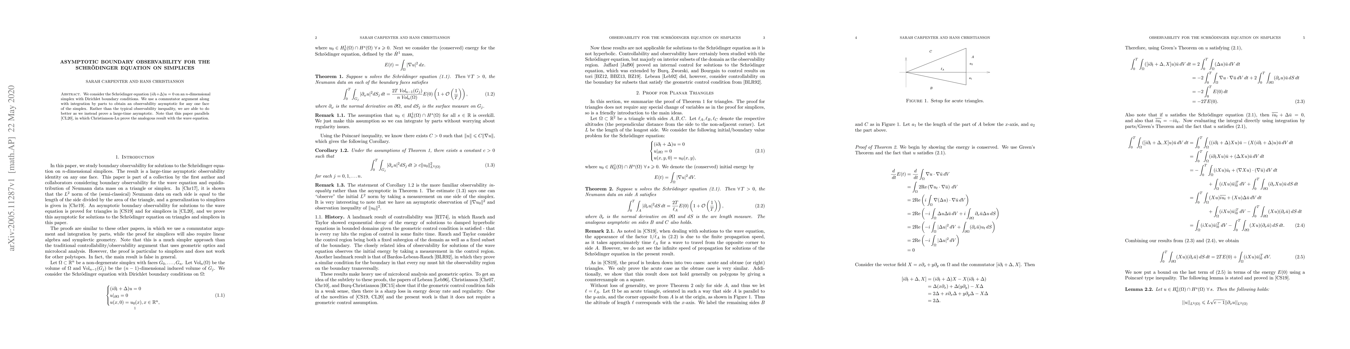This paper investigates the asymptotic boundary observability for the Schrödinger equation on an n-dimensional simplex with Dirichlet boundary conditions. It employs a commutator argument and integration by parts to establish an observability asymptotic for any one face, proving a large-time asymptotic rather than a typical observability inequality.