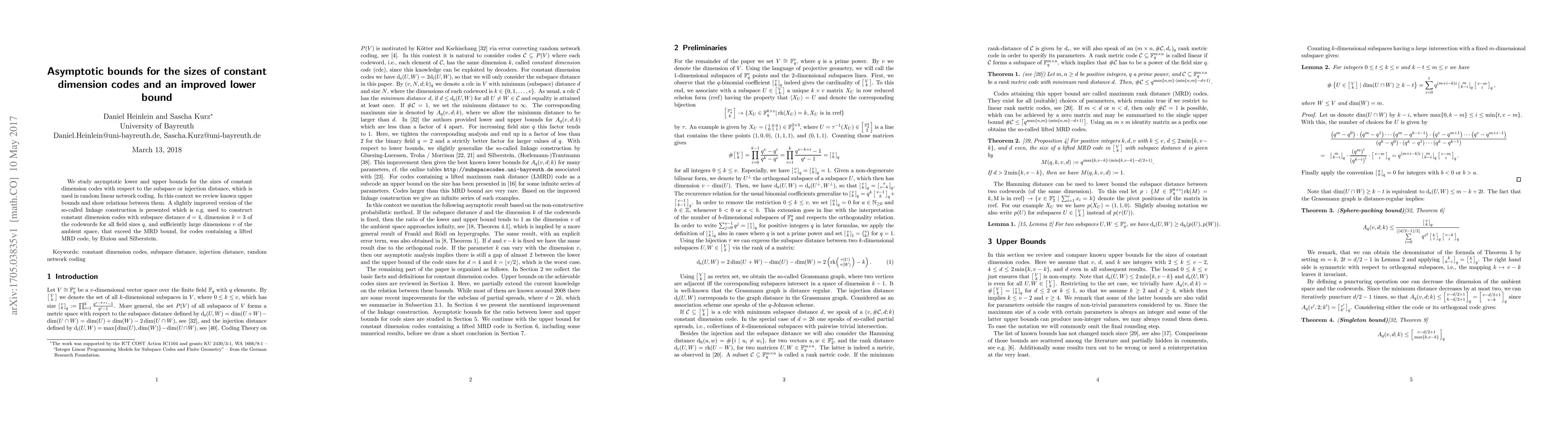 This paper investigates asymptotic bounds for constant dimension codes, focusing on the subspace or injection distance relevant to random linear network coding. It presents an improved version of the linkage construction, enhancing the construction of codes that exceed the MRD bound for large dimensions.