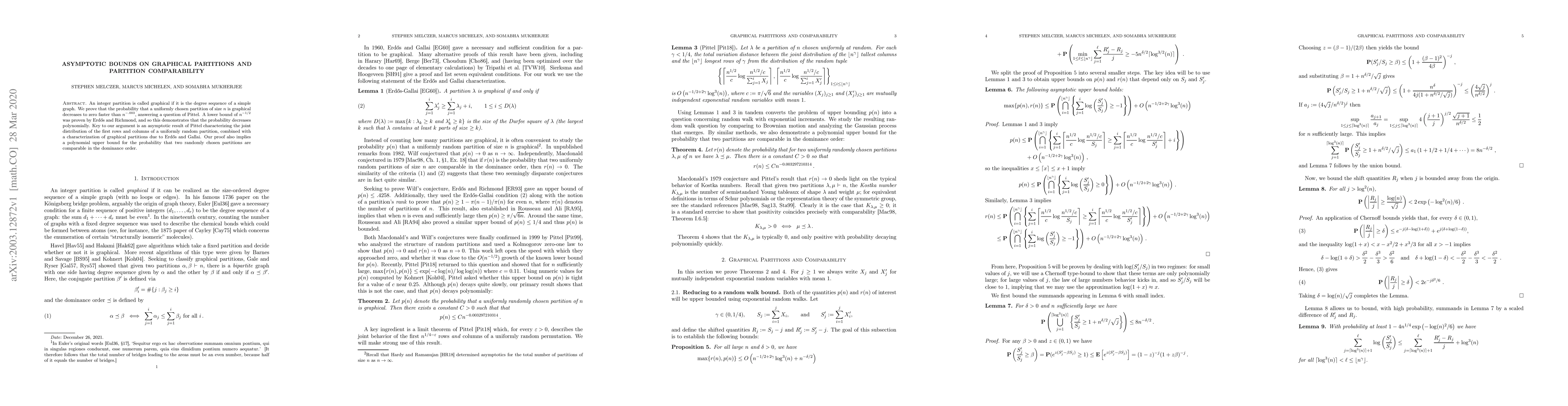 This paper proves that the probability of a uniformly chosen partition of size $n$ being graphical decreases faster than $n^{-0.003}$, showing a polynomial decay. It also establishes a polynomial upper bound for the probability of two randomly chosen partitions being comparable in the dominance order.