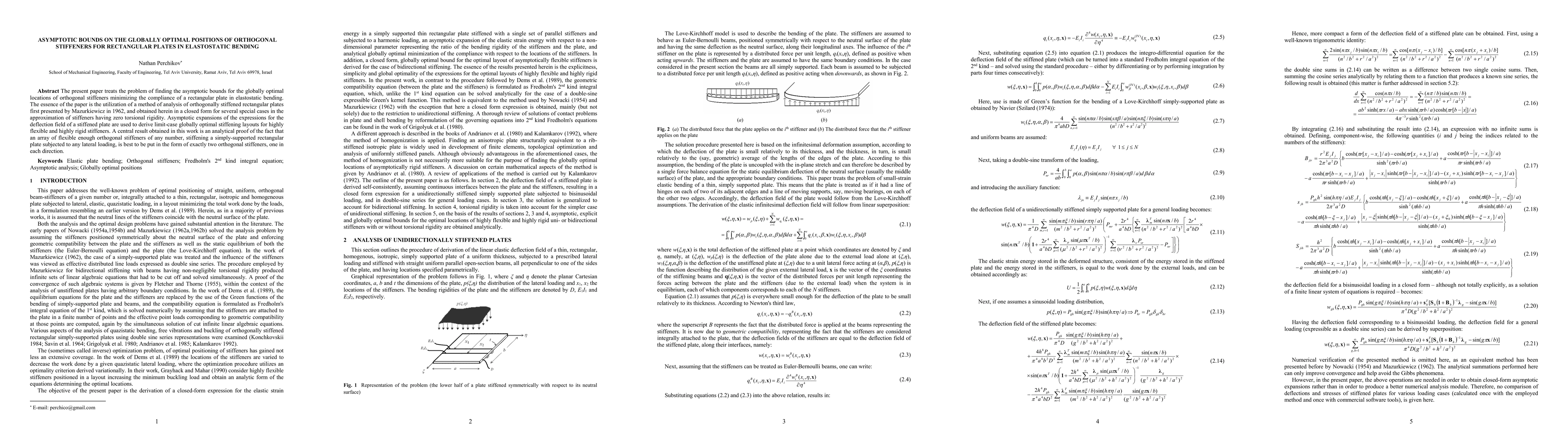 The present paper treats the problem of finding the asymptotic bounds for the globally optimal locations of orthogonal stiffeners minimizing the compliance of a rectangular plate in elastostatic bending. The essence of the paper is the utilization of a method of analysis of orthogonally stiffened rectangular plates first presented by Mazurkiewicz in 1962, and obtained herein in a closed form for several special cases in the approximation of stiffeners having zero torsional rigidity. Asymptotic expansions of the expressions for the deflection field of a stiffened plate are used to derive limit-case globally optimal stiffening layouts for highly flexible and highly rigid stiffeners. A central result obtained in this work is an analytical proof of the fact that an array of flexible enough orthogonal stiffeners of any number, stiffening a simply-supported rectangular plate subjected to any lateral loading, is best to be put in the form of exactly two orthogonal stiffeners, one in each direction.