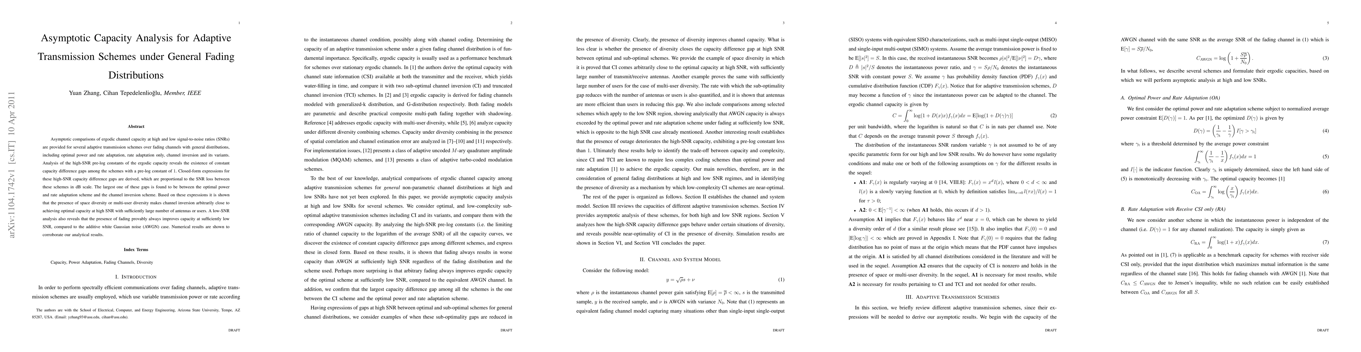 This paper analyzes asymptotic capacity of adaptive transmission schemes under general fading distributions, revealing constant capacity difference gaps among schemes, with channel inversion being arbitrarily close to optimal capacity at high SNR with multiple antennas or users.