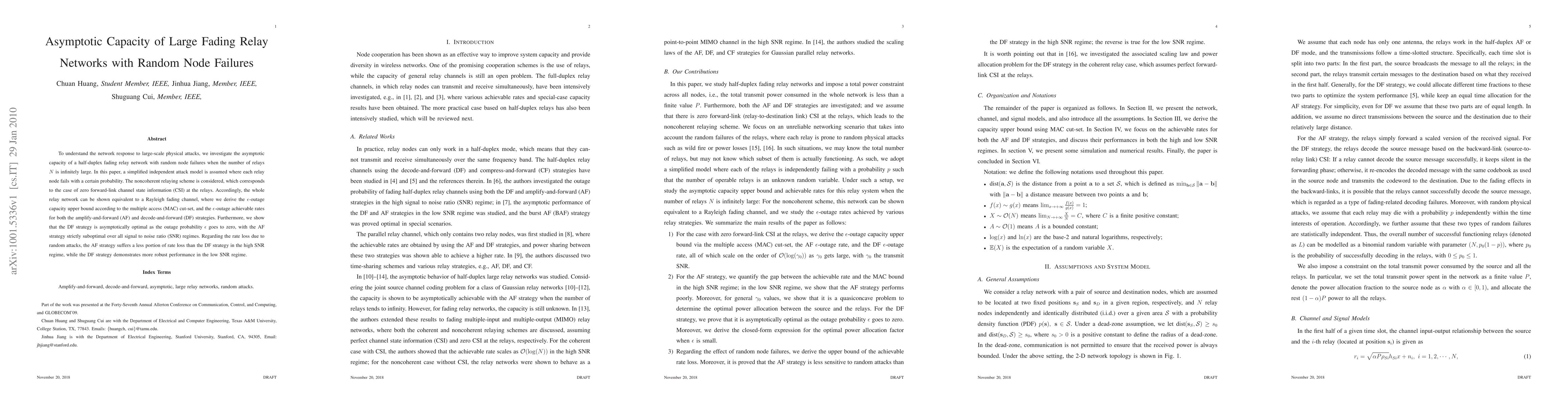 This paper investigates the asymptotic capacity of large-scale fading relay networks with random node failures under noncoherent relaying. It finds that the decode-and-forward strategy is asymptotically optimal, while amplify-and-forward shows less rate loss in high SNR regimes.