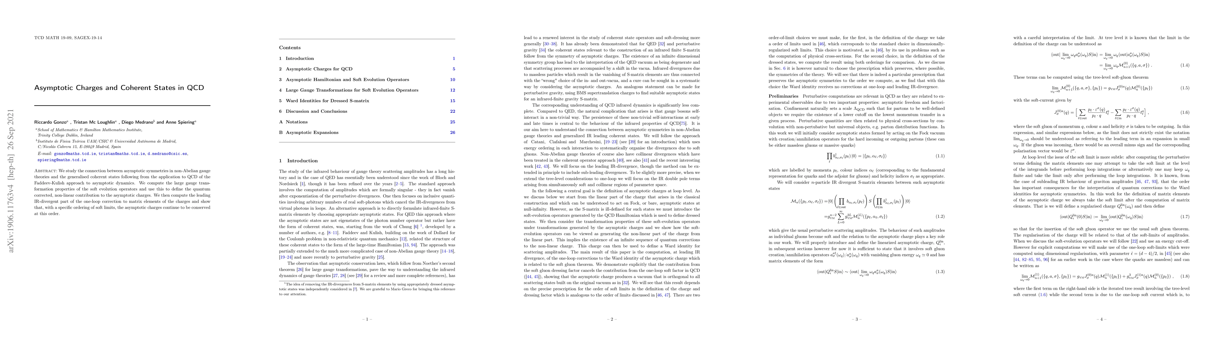 This paper investigates the relationship between asymptotic symmetries in QCD and generalised coherent states, defining quantum corrected non-linear contributions to asymptotic charges. It finds that while one ordering preserves the conservation law, another introduces a correction proportional to the one-loop soft current.