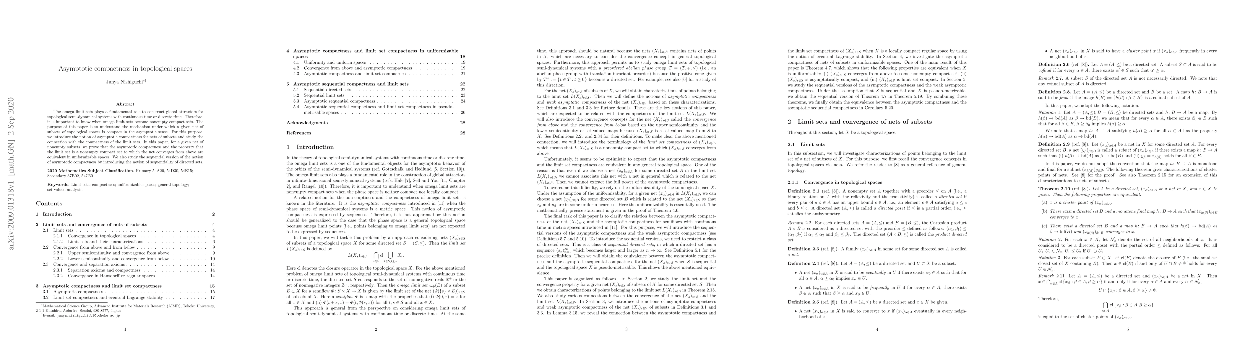The omega limit sets plays a fundamental role to construct global attractors for topological semi-dynamical systems with continuous time or discrete time. Therefore, it is important to know when omega limit sets become nonempty compact sets. The purpose of this paper is to understand the mechanism under which a given net of subsets of topological spaces is compact in the asymptotic sense. For this purpose, we introduce the notion of asymptotic compactness for nets of subsets and study the connection with the compactness of the limit sets. In this paper, for a given net of nonempty subsets, we prove that the asymptotic compactness and the property that the limit set is a nonempty compact set to which the net converges from above are equivalent in uniformizable spaces. We also study the sequential version of the notion of asymptotic compactness by introducing the notion of sequentiality of directed sets.