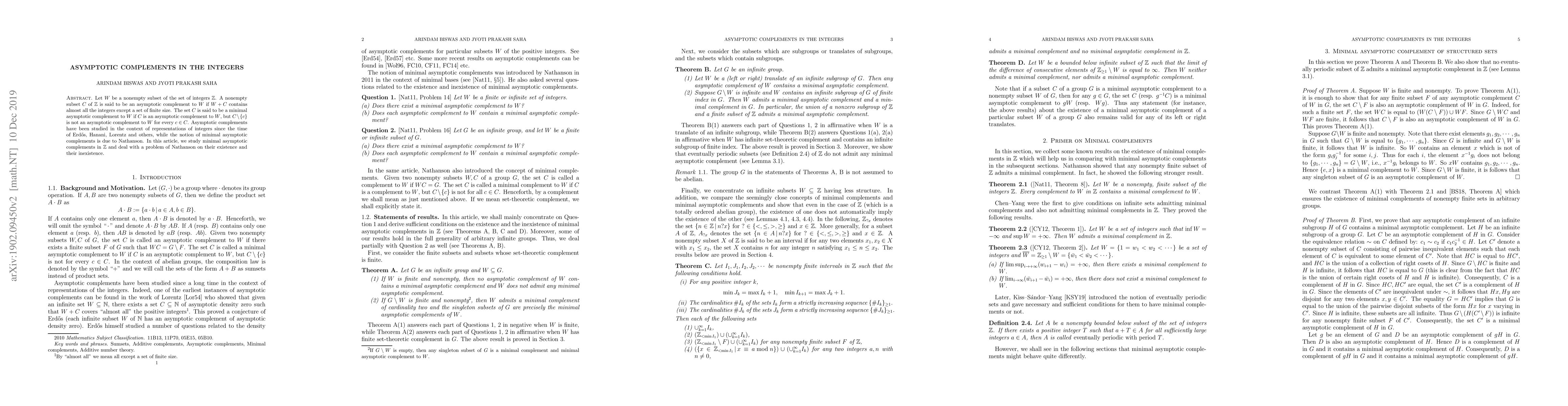 Let $W\subseteq \mathbb{Z}$ be a non-empty subset of the integers. A nonempty set $C\subseteq \mathbb{Z}$ is said to be an asymptotic complement to $W$ if $W+C$ contains almost all the integers except a set of finite size. $C$ is said to be a minimal asymptotic complement if $C$ is an asymptotic complement, but $C\setminus \lbrace c\rbrace$ is not an asymptotic complement $\forall c\in C$. Asymptotic complements have been studied in the context of representations of integers since the time of Erd\H{o}s, Hanani, Lorentz and others, while the notion of minimal asymptotic complements is due to Nathanson. In this article, we study minimal asymptotic complements in $\mathbb{Z}$ and deal with a problem of Nathanson on their existence and their inexistence.