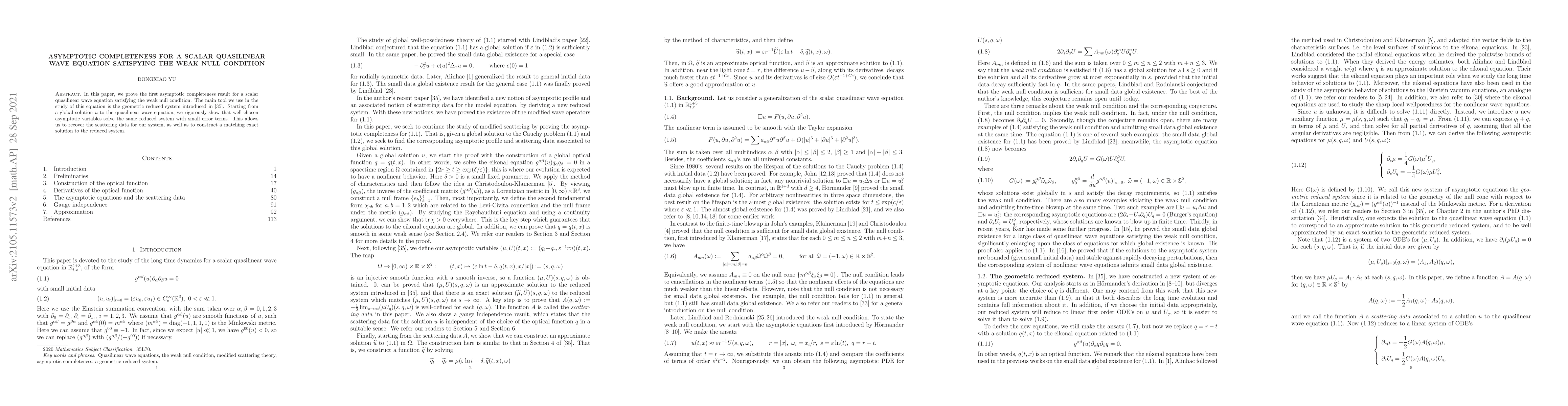 In this paper, we prove the first asymptotic completeness result for a scalar quasilinear wave equation satisfying the weak null condition. The main tool we use in the study of this equation is the geometric reduced system introduced in arXiv:2002.05355. Starting from a global solution $u$ to the quasilinear wave equation, we rigorously show that well chosen asymptotic variables solve the same reduced system with small error terms. This allows us to recover the scattering data for our system, as well as to construct a matching exact solution to the reduced system.