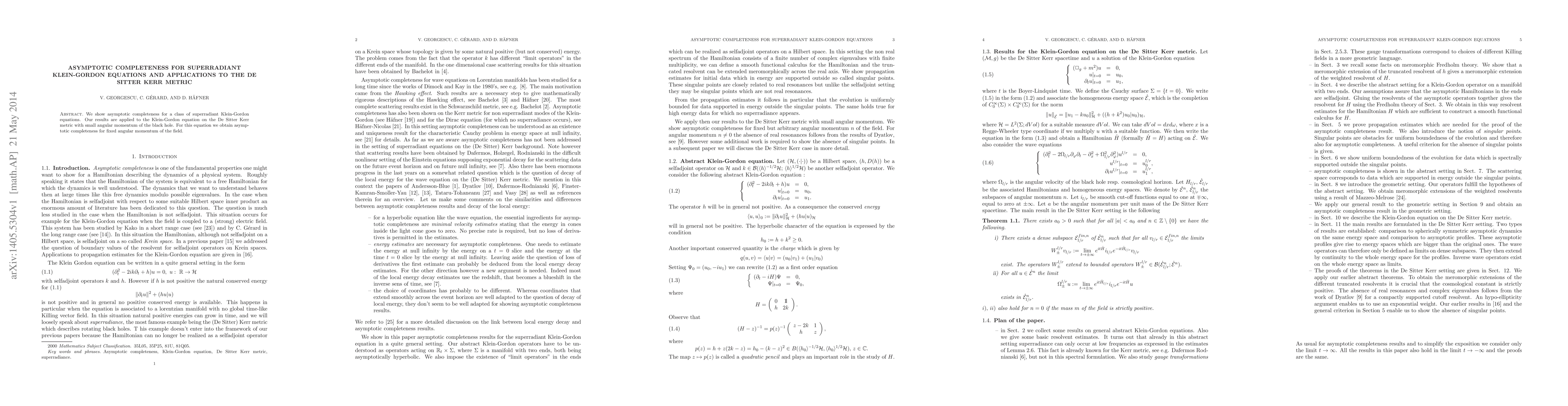 Summary: The paper demonstrates asymptotic completeness for superradiant Klein-Gordon equations and applies this to the Klein-Gordon equation on the De Sitter Kerr metric, achieving asymptotic completeness for small black hole angular momentum.