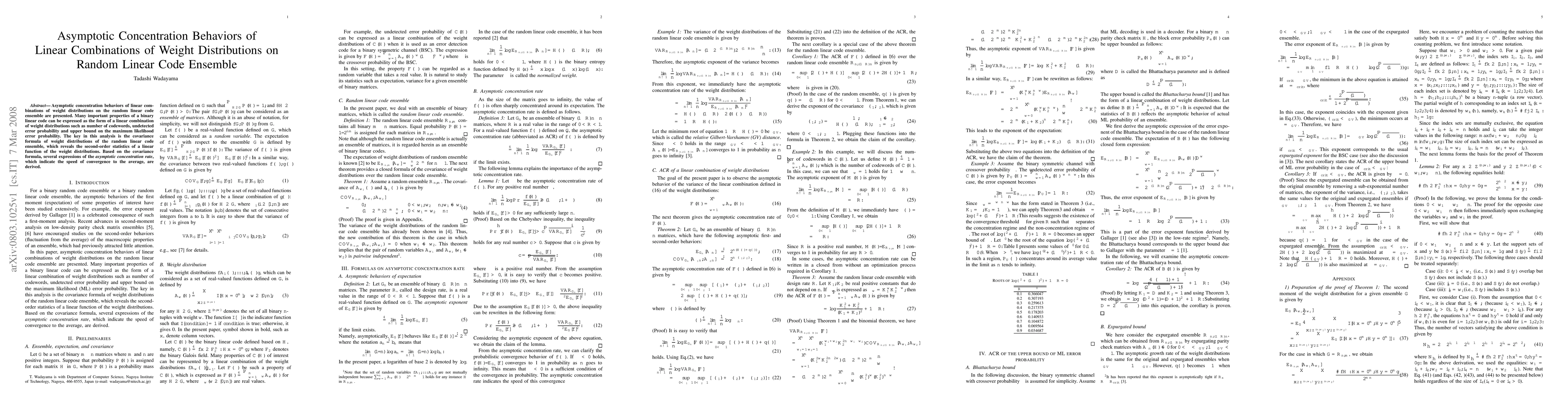 This paper explores how linear combinations of weight distributions in random linear codes converge to averages, with implications for error probabilities and coding properties.