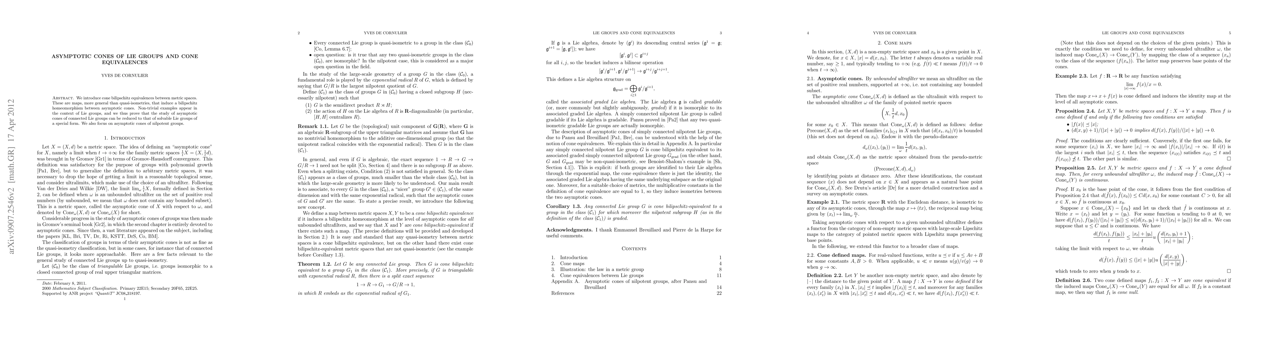 The paper introduces cone bilipschitz equivalences, which generalize quasi-isometries, and shows they induce bilipschitz homeomorphisms between asymptotic cones. It demonstrates that studying asymptotic cones of connected Lie groups reduces to studying those of special solvable Lie groups, with particular emphasis on nilpotent groups.