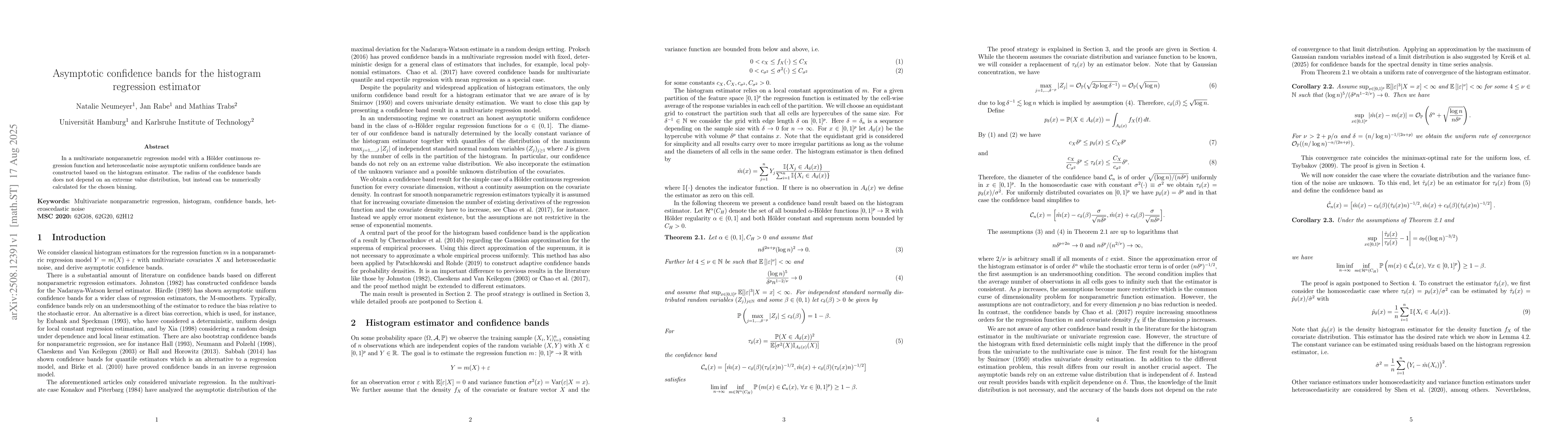 In a multivariate nonparametric regression model with a H\"older continuous regression function and heteroscedastic noise asymptotic uniform confidence bands are constructed based on the histogram estimator. The radius of the confidence bands does not depend on an extreme value distribution, but instead can be numerically calculated for the chosen binning.