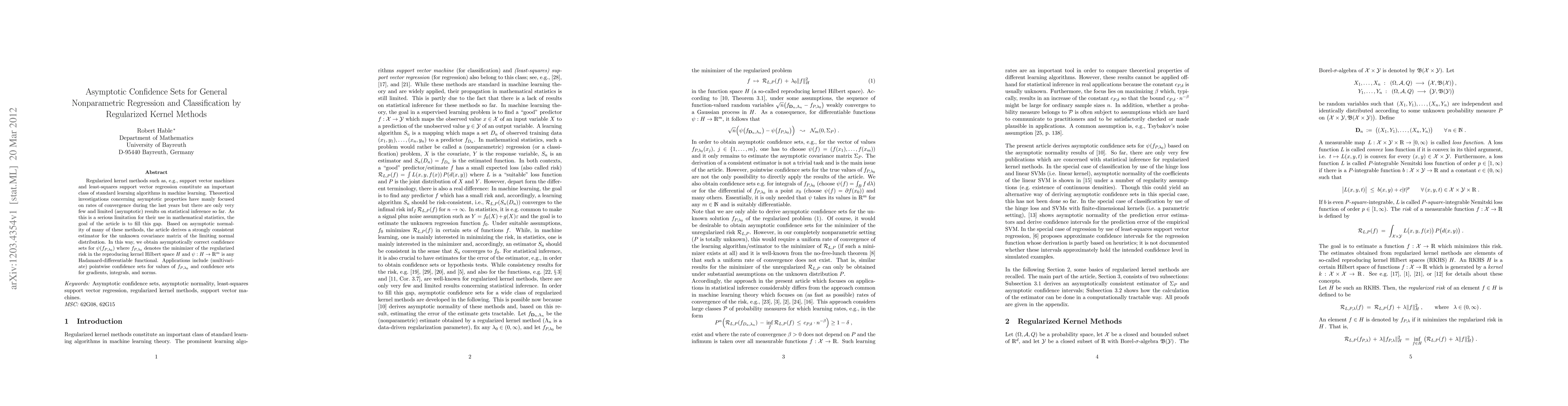 This research paper addresses the gap in asymptotic statistical inference for regularized kernel methods, such as support vector machines and least-squares support vector regression. It derives a consistent estimator for the covariance matrix of the limiting normal distribution, enabling the creation of asymptotically correct confidence sets for various functionals of the minimizer in reproducing kernel Hilbert spaces. Applications include confidence sets for function values, gradients, integrals, and norms.
