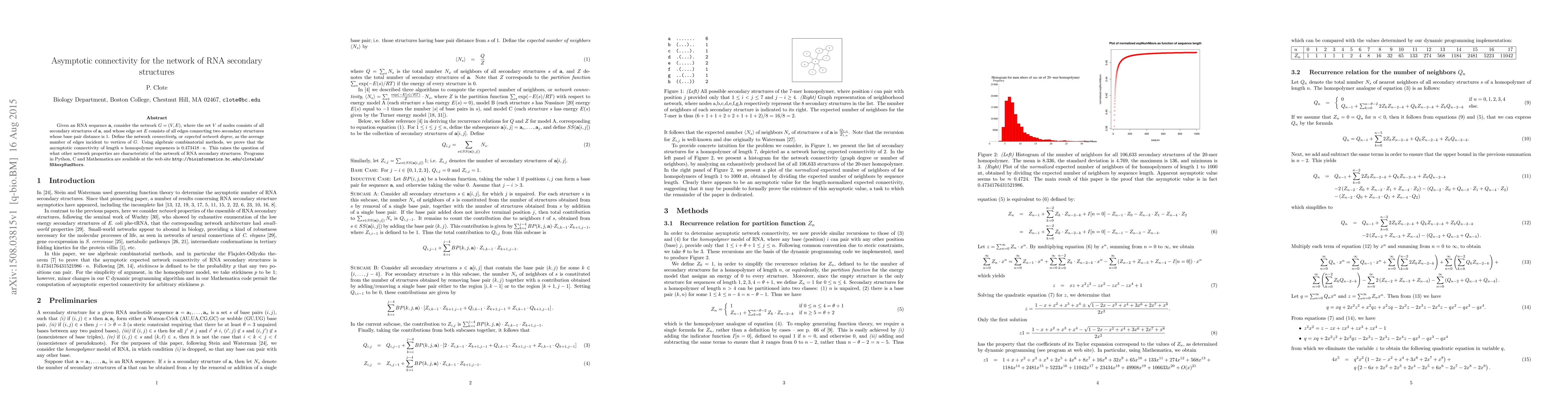 Given an RNA sequence a, consider the network G = (V;E), where the set V of nodes consists of all secondary structures of a, and whose edge set E consists of all edges connecting two secondary structures whose base pair distance is 1. Define the network connectivity, or expected network degree, as the average number of edges incident to vertices of G. Using algebraic combinatorial methods, we prove that the asymptotic connectivity of length n homopolymer sequences is 0:473418 ? n. This raises the question of what other network properties are characteristic of the network of RNA secondary structures. Programs in Python, C and Mathematica are available at the web site http://bioinformatics.bc.edu/clotelab/ RNAexpNumNbors.