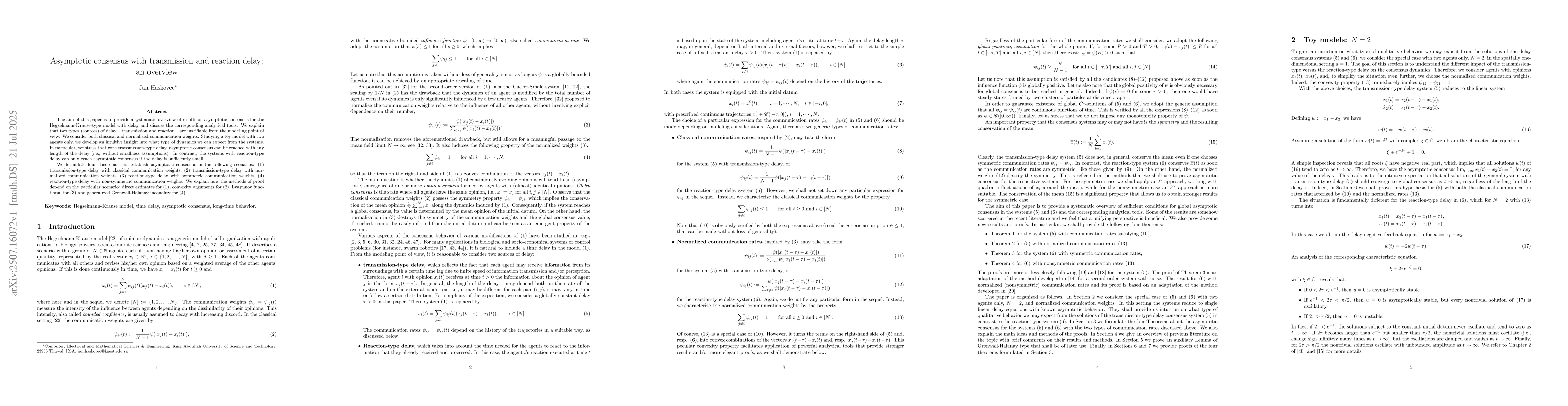 The aim of this paper is to provide a systematic overview of results on asymptotic consensus for the Hegselmann-Krause-type model with delay and discuss the corresponding analytical tools. We explain that two types (sources) of delay - transmission and reaction - are justifiable from the modeling point of view. We consider both classical and normalized communication weights. Studying a toy model with two agents only, we develop an intuitive insight into what type of dynamics we can expect from the systems. In particular, we stress that with transmission-type delay, asymptotic consensus can be reached with any length of the delay (i.e., without smallness assumptions). In contrast, the systems with reaction-type delay can only reach asymptotic consensus if the delay is sufficiently small. We formulate four theorems that establish asymptotic consensus in the following scenarios: (1) transmission-type delay with classical communication weights, (2) transmission-type delay with normalized communication weights, (3) reaction-type delay with symmetric communication weights, (4) reaction-type delay with non-symmetric communication weights. We explain how the methods of proof depend on the particular scenario: direct estimates for (1), convexity arguments for (2), Lyapunov functional for (3) and generalized Gronwall-Halanay inequality for (4).