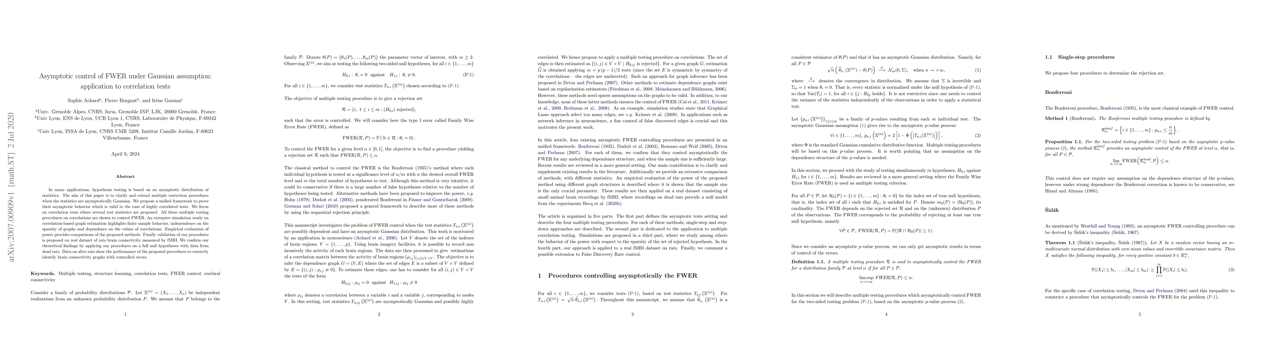 Researchers developed a unified framework to prove the asymptotic behavior of multiple correction procedures for correlation tests under Gaussian assumption, controlling false positive rate (FWER) in various applications including graph estimation and brain connectivity analysis.