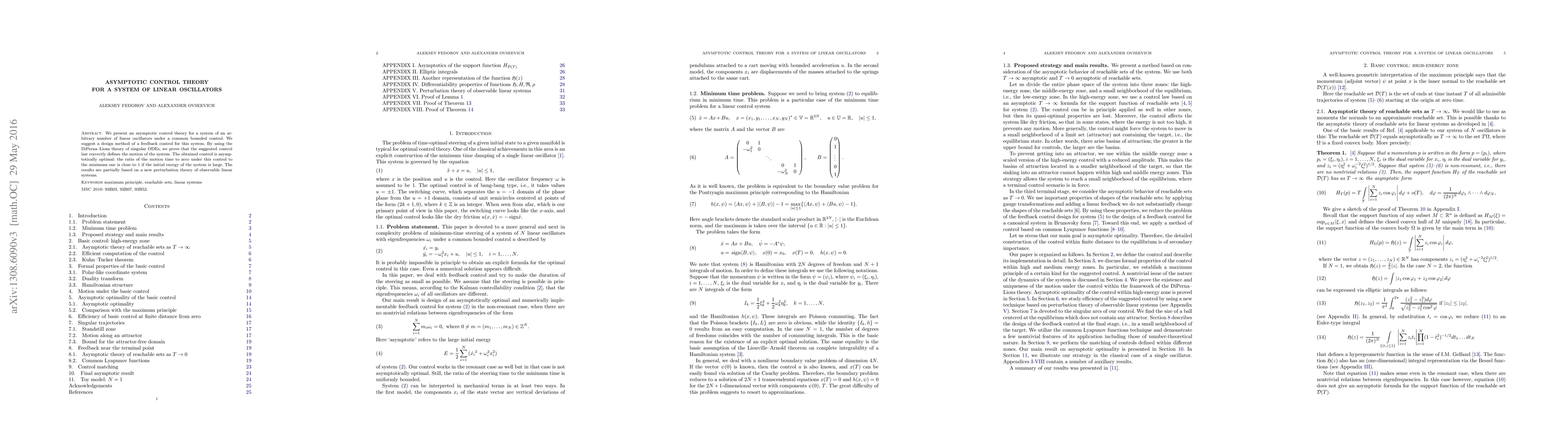 This paper presents an asymptotic control theory for a system of linear oscillators, suggesting a feedback control design method that optimizes motion time with large initial energy levels.