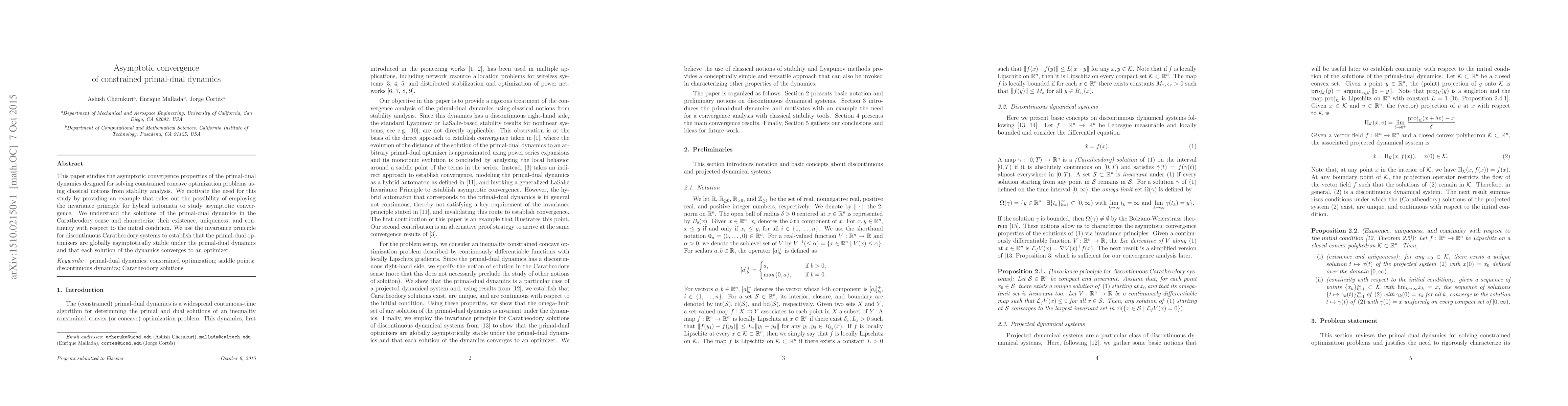 This paper investigates the asymptotic convergence of primal-dual dynamics for solving constrained concave optimization problems, establishing global asymptotic stability and solution convergence to optimizers using the invariance principle for discontinuous Caratheodory systems. It highlights the limitations of using hybrid automata invariance principles for such studies.