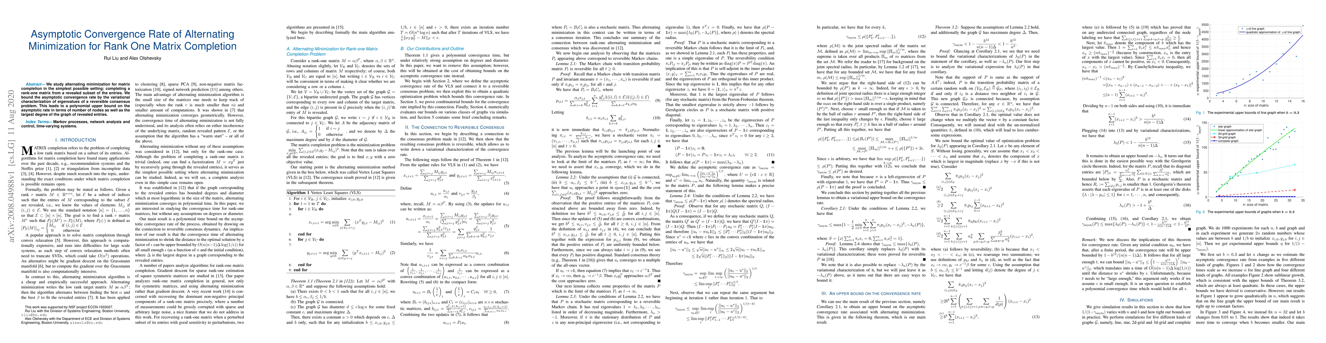 This paper investigates the asymptotic convergence rate of alternating minimization for completing a rank-one matrix from a subset of revealed entries. It establishes a polynomial upper bound on the convergence rate based on the eigenvalues of a reversible consensus problem, influenced by the number of nodes and the largest degree of the graph representing revealed entries.