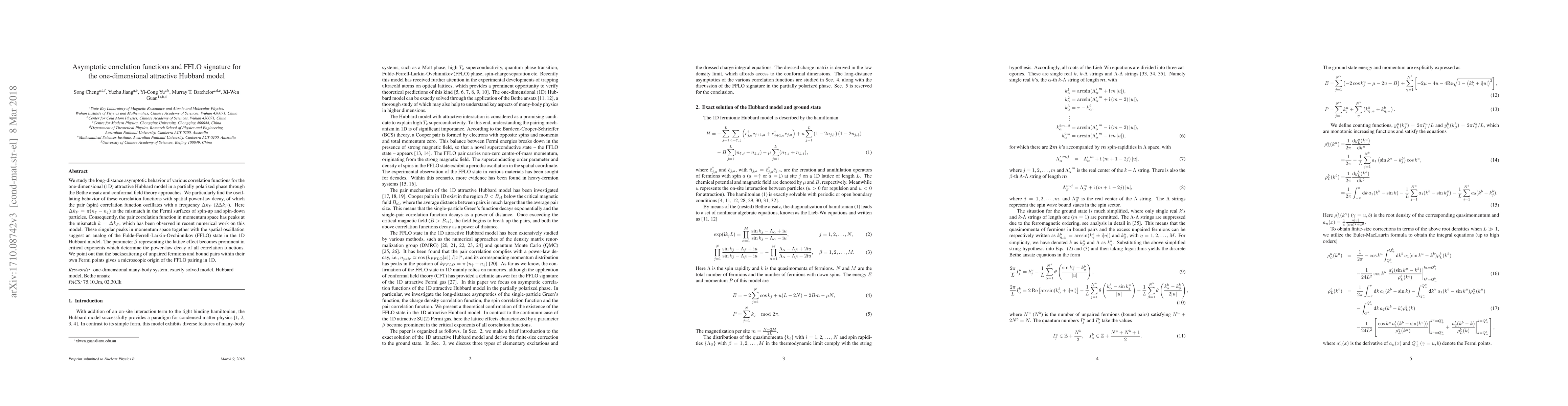This paper investigates the asymptotic behavior of correlation functions in the one-dimensional attractive Hubbard model, revealing oscillating spatial decay and peaks in momentum space indicative of an FFLO state analog. The study highlights the role of the parameter $\beta$ in determining critical exponents and the microscopic origin of FFLO pairing through backscattering effects.