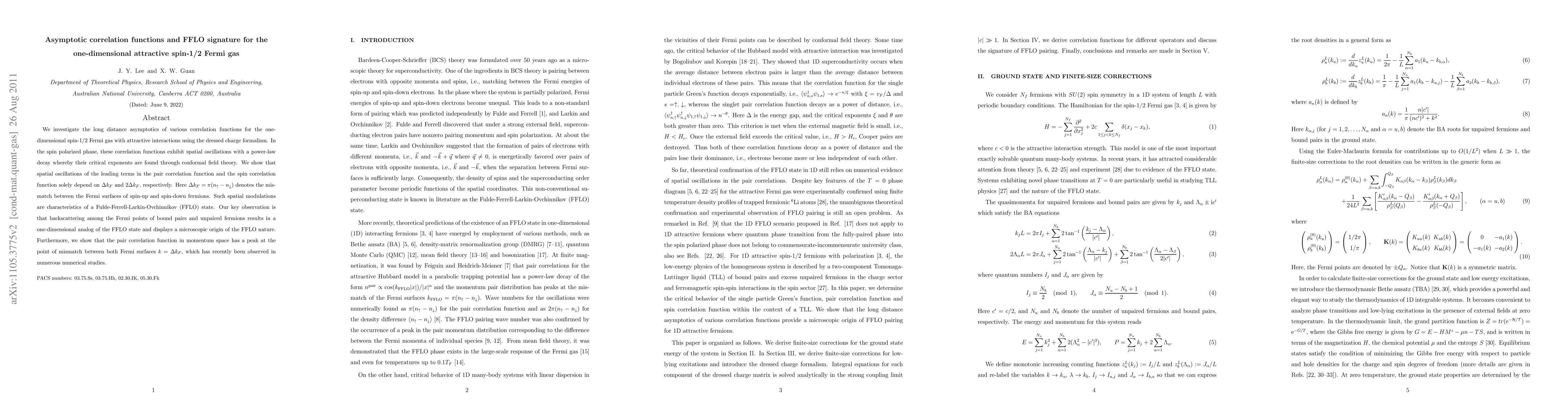 This paper investigates the asymptotic behavior of correlation functions in a one-dimensional attractive spin-1/2 Fermi gas, revealing spatial oscillations indicative of a Fulde-Ferrell-Larkin-Ovchinnikov (FFLO) state. The study finds that these oscillations arise from backscattering among bound pairs and unpaired fermions, providing a microscopic origin for FFLO characteristics.