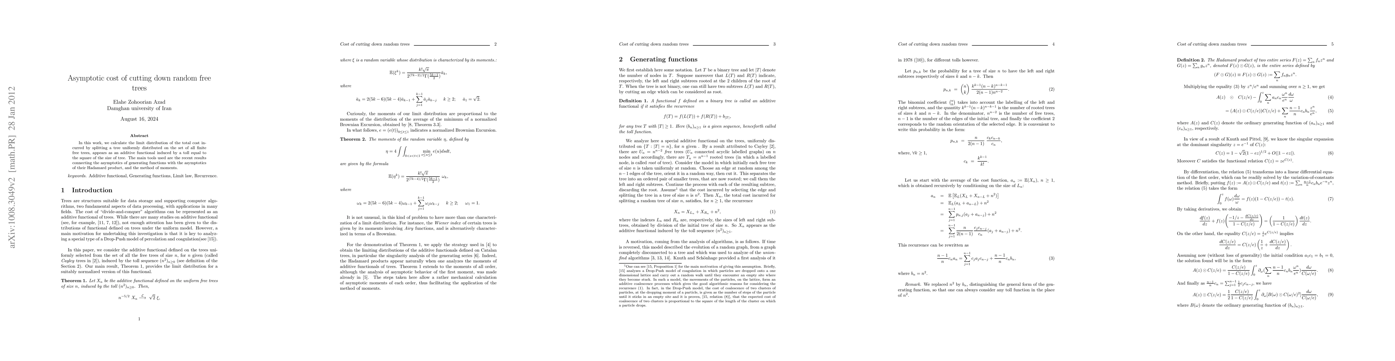 The limit distribution of the total cost incurred by splitting a tree uniformly distributed on the set of all finite free trees, appears as an additive functional induced by a toll equal to the square of the size of tree. The main tools used are the recent results connecting the asymptotics of generating functions with the asymptotics of their Hadamard product, and the method of moments.