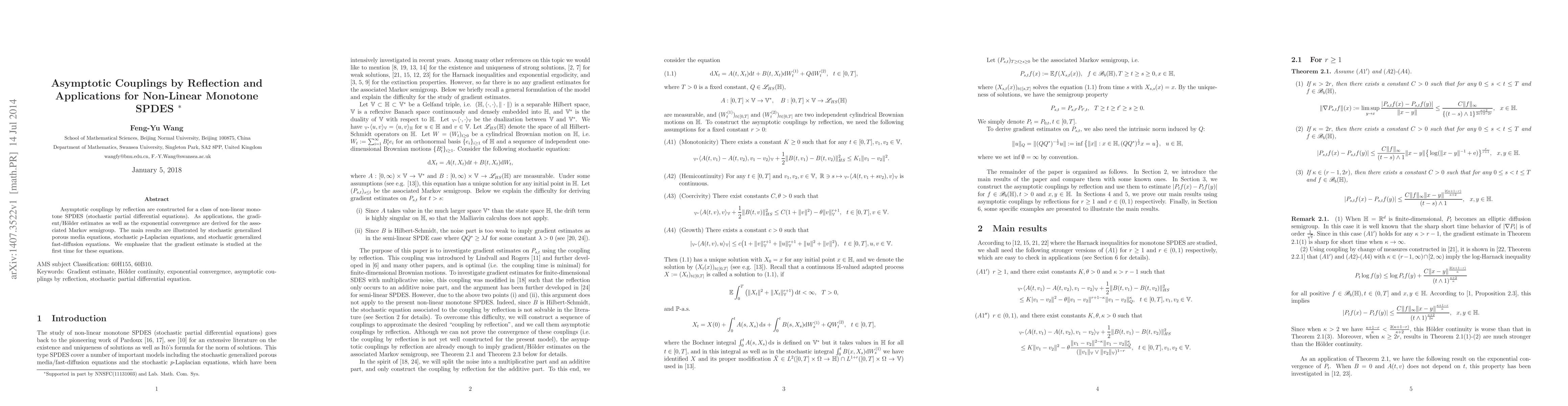 Asymptotic couplings by reflection are constructed for a class of non-linear monotone SPDES (stochastic partial differential equations). As applications, the gradient/H\"older estimates as well as the exponential convergence are derived for the associated Markov semigroup. The main results are illustrated by stochastic generalized porous media equations, stochastic $p$-Laplacian equations, and stochastic generalized fast-diffusion equations. We emphasize that the gradient estimate is studied at the first time for these equations.