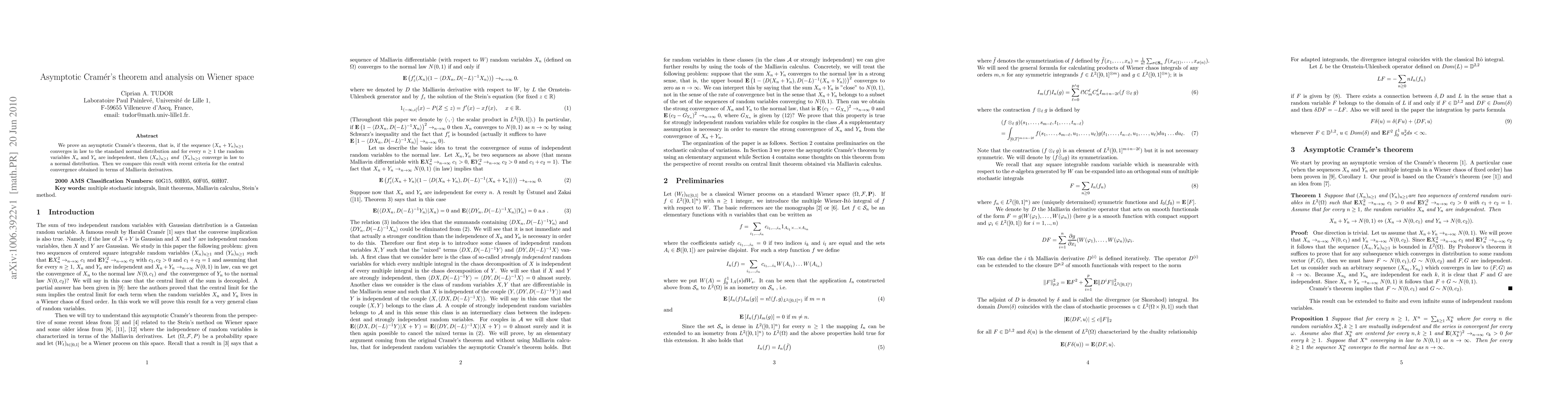 This paper proves an asymptotic version of Cramér's theorem on convergence in law to normal distributions, showing that if a sequence converges to a standard normal, its independent components also converge in law to normal distributions. The study also compares this result with recent convergence criteria based on Malliavin derivatives.