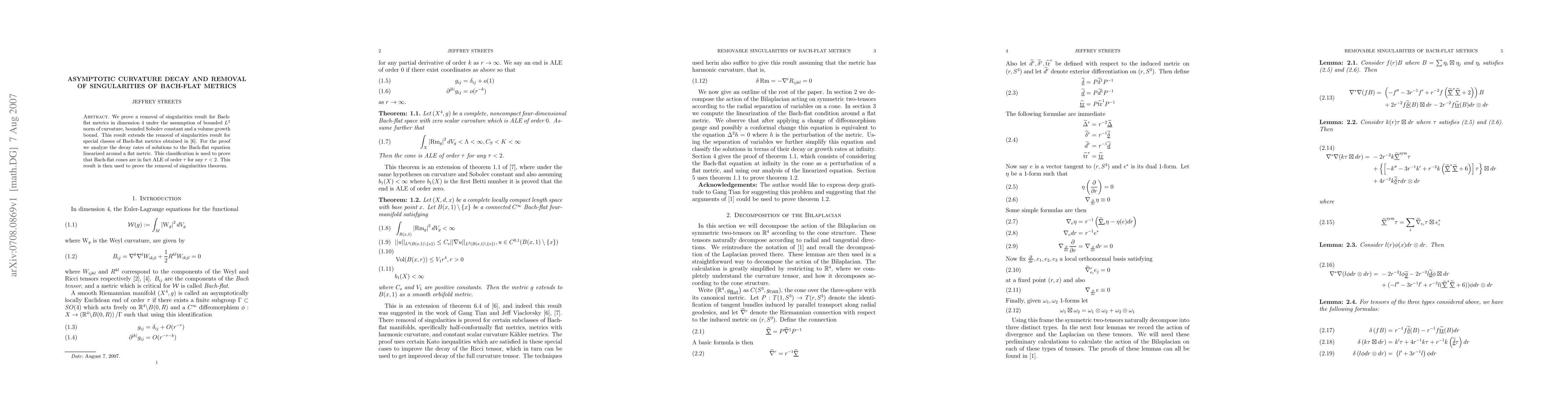 This paper proves the removal of singularities for Bach-flat metrics in dimension 4, given certain bounded curvature, Sobolev, and volume growth conditions. The proof leverages the decay rates of linearized Bach-flat equations and shows that Bach-flat cones are ALE of order $\tau$ for any $\tau < 2$, leading to the singularity removal theorem.