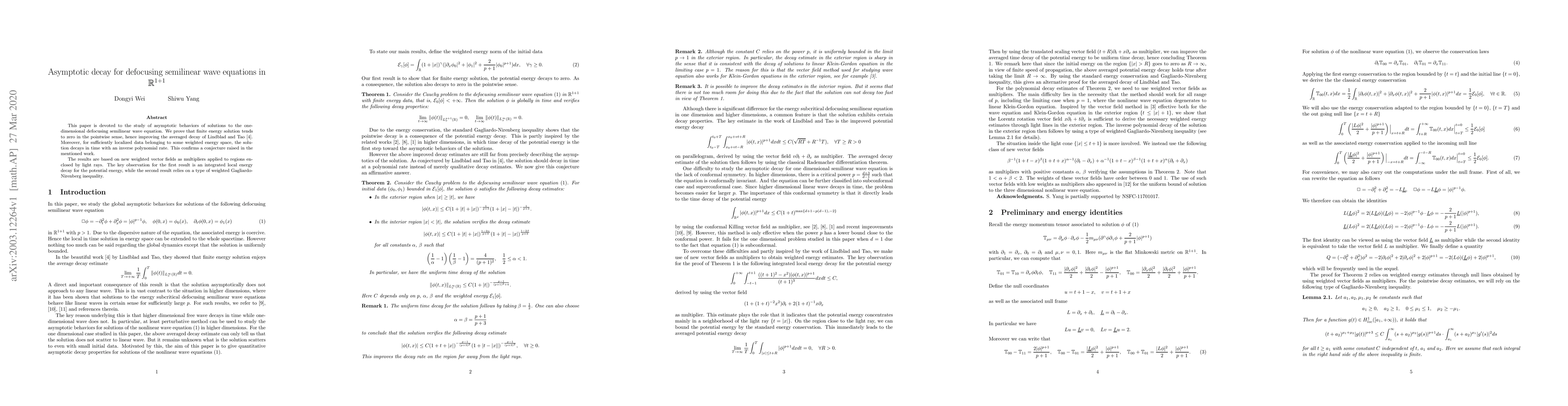This paper investigates the asymptotic decay of solutions to the one-dimensional defocusing semilinear wave equation, proving that finite energy solutions tend to zero over time. It also confirms a conjecture by showing that solutions with sufficiently localized data decay at an inverse polynomial rate, utilizing new weighted vector fields and inequalities.