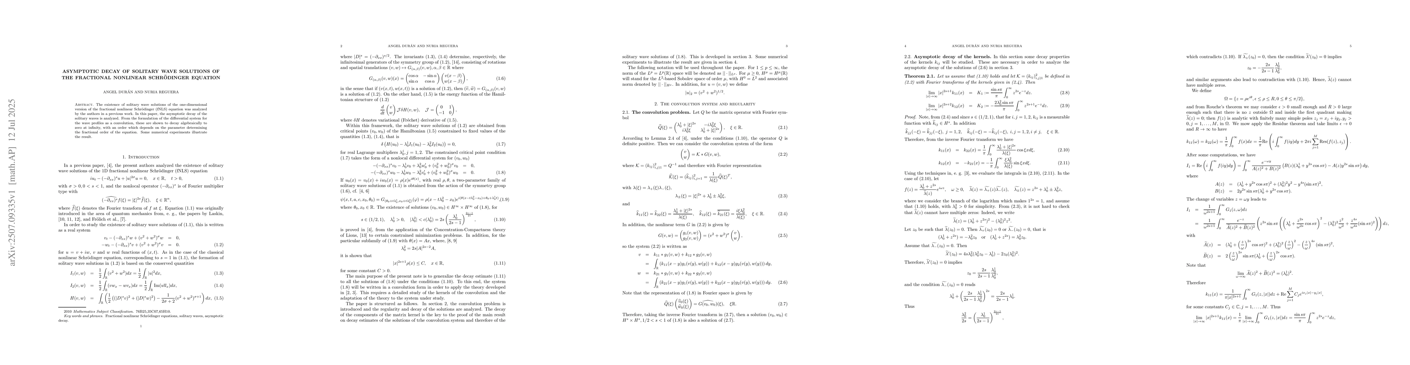 The existence of solitary wave solutions of the one-dimensional version of the fractional nonlinear Schr\"{o}dinger (fNLS) equation was analyzed by the authors in a previous work. In this paper, the asymptotic decay of the solitary waves is analyzed. From the formulation of the differential system for the wave profiles as a convolution, these are shown to decay algebraically to zero at infinity, with an order which depends on the parameter determining the fractional order of the equation. Some numerical experiments illustrate the result.