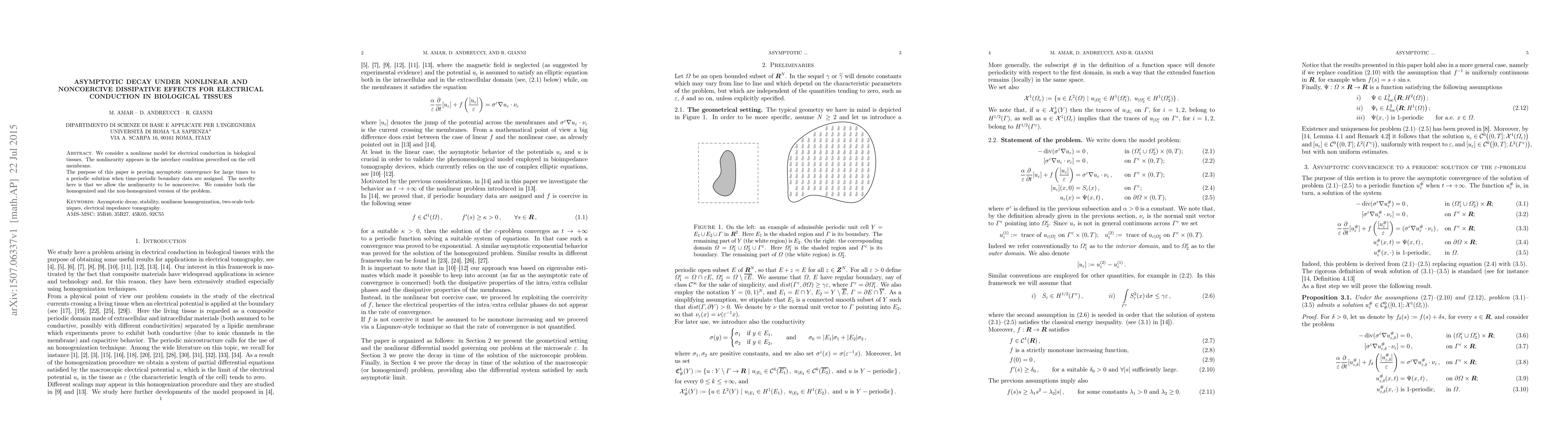 This research paper investigates how electrical conduction in biological tissues behaves over long periods of time, considering nonlinear effects that occur at the cell membrane. It shows that even noncoercive (non-stiff) nonlinearities can lead to periodic solutions under certain conditions.