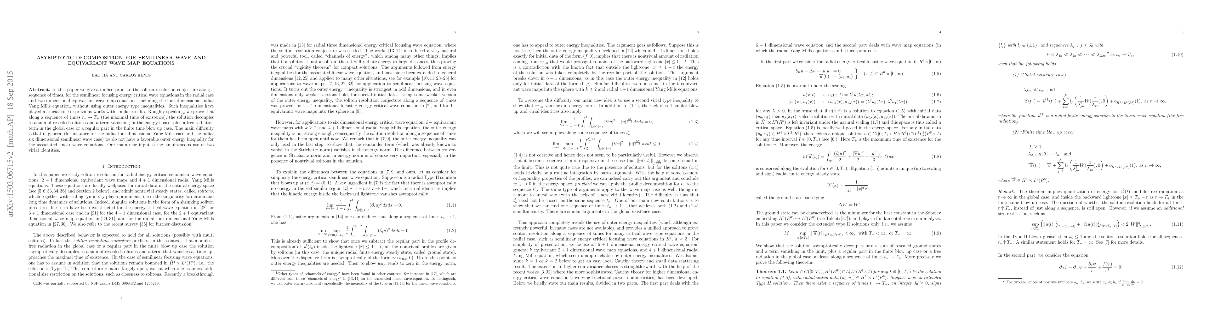 In this paper we give a unified proof to the soliton resolution conjecture along a sequence of times, for the semilinear focusing energy critical wave equations in the radial case and two dimensional equivariant wave map equations, including the four dimensional radial Yang Mills equation, without using outer energy type inequalities. Such inequalities have played a crucial role in previous works with similar results. Roughly speaking, we prove that along a sequence of times approaching the maximal time of existence, the solution decouples to a sum of rescaled solitons and a term vanishing in the energy space, plus a free radiation term in the global case or a regular part in the finite time blow up case. The main difficulty is that in general (for instance for the radial four dimensional Yang Mills case and the radial six dimensional semilinear wave case) we do not have a favorable outer energy inequality for the associated linear wave equations. Our main new input is the simultaneous use of two virial identities.