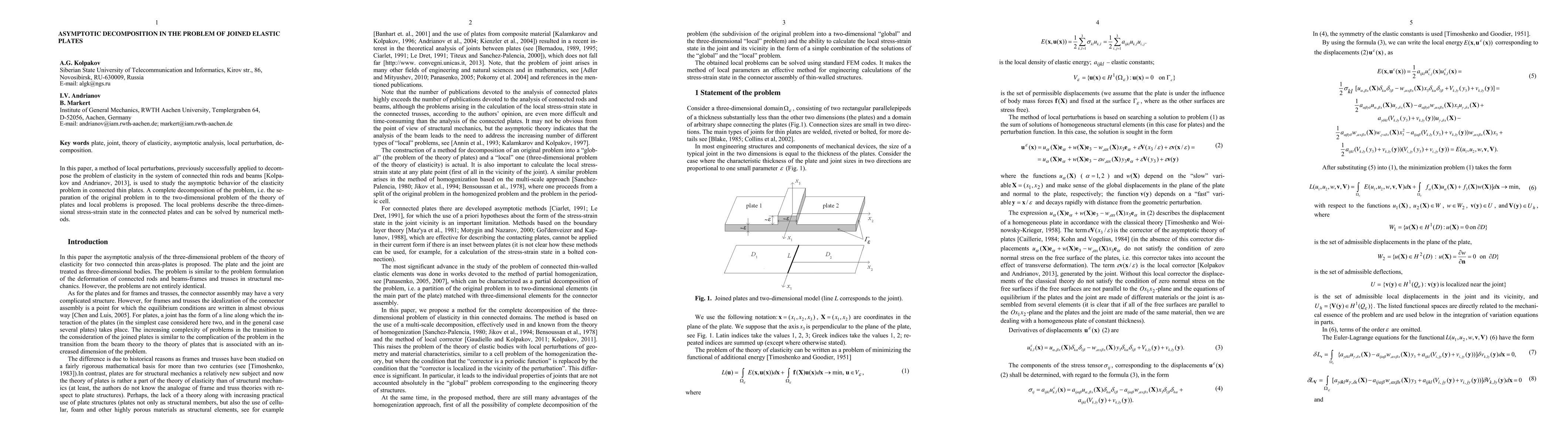 This paper applies a local perturbation method to decompose the elasticity problem of connected thin plates into a two-dimensional plate theory problem and solvable local three-dimensional stress-strain problems, facilitating numerical solutions. The approach builds on previous successes in similar decompositions for thin rods and beams.